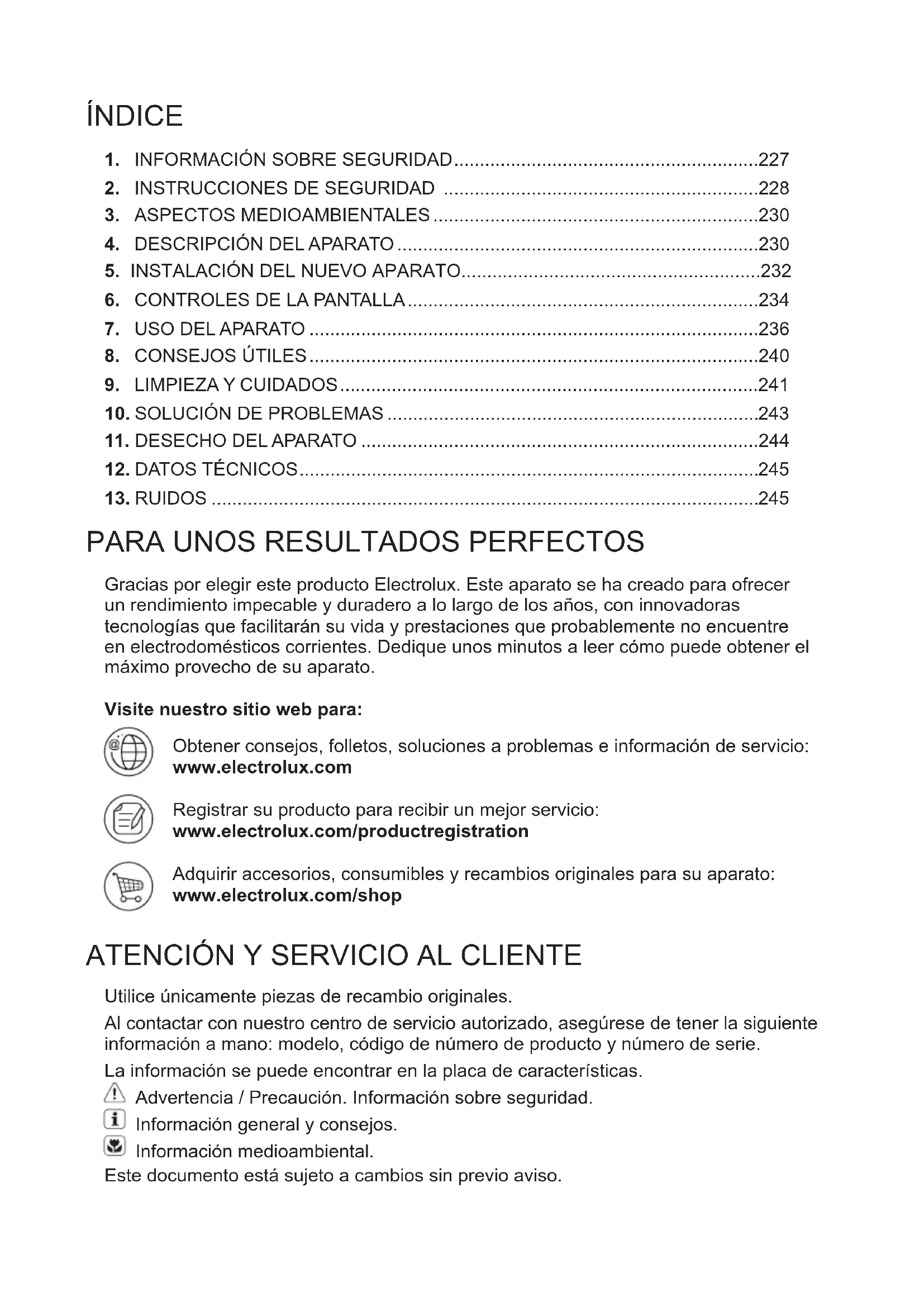 Gracias por elegir este producto Electrolux. Este aparato se ha creado para ofrecer un rendimiento impecable y duradero a lo largo de los años, con innovadoras tecnologías que facilitarán su vida y prestaciones que probablemente no encuentre en electrodomésticos corrientes. Dedique unos minutos a leer cómo puede obtener el máximo provecho de su aparato. Visite nuestro sitio web para: Obtener consejos, folletos, soluciones a problemas e información de servicio: www.electrolux.com Registrar su producto para recibir un mejor servicio: www.electrolux.com/productregistration Adquirir accesorios, consumibles y recambios originales para su aparato: www.electrolux.com/shop