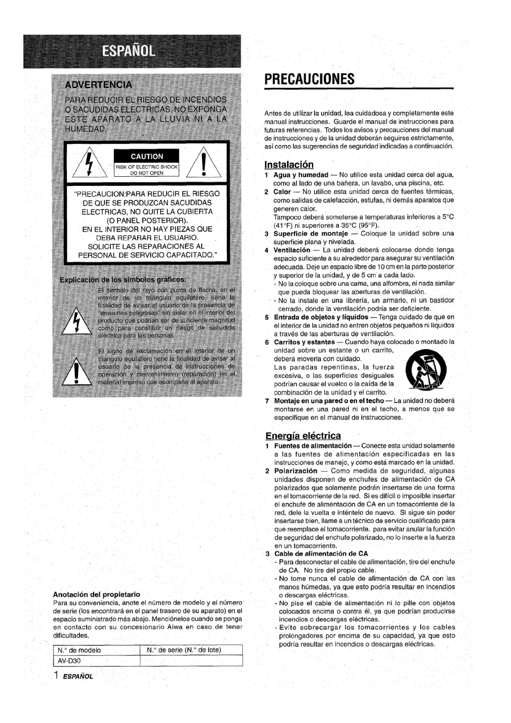 ENGLISH 18Para su conveniencia, anote el ntimero de modelo y el numero de serie (Ios encontrara en el panel trasero de su aparato) en el espacio suministrado mas abajo. Mencionelos cuando se ponga en contacto con su concesionario Aiwa en caso de tener dificultades. N.” de modelo N.” de serie (N.O de Iote) AV-D30 1 ESPA/kM PRECAUCIONES Antes de utilizar la unidad, lea cuidadosa y completamente este manual instrucciones. Guarde el manual de instrucciones para futuras referencias. Todos Ios avisos y precauciones del manual de instrucciones y de la unidad deberan seguirse estrictamente, asi como Ias sugerencias de seguridad indicadas a continuation. Instalacion “ 1 Agua y humedad — No utilice esta unidad cerca del agua,