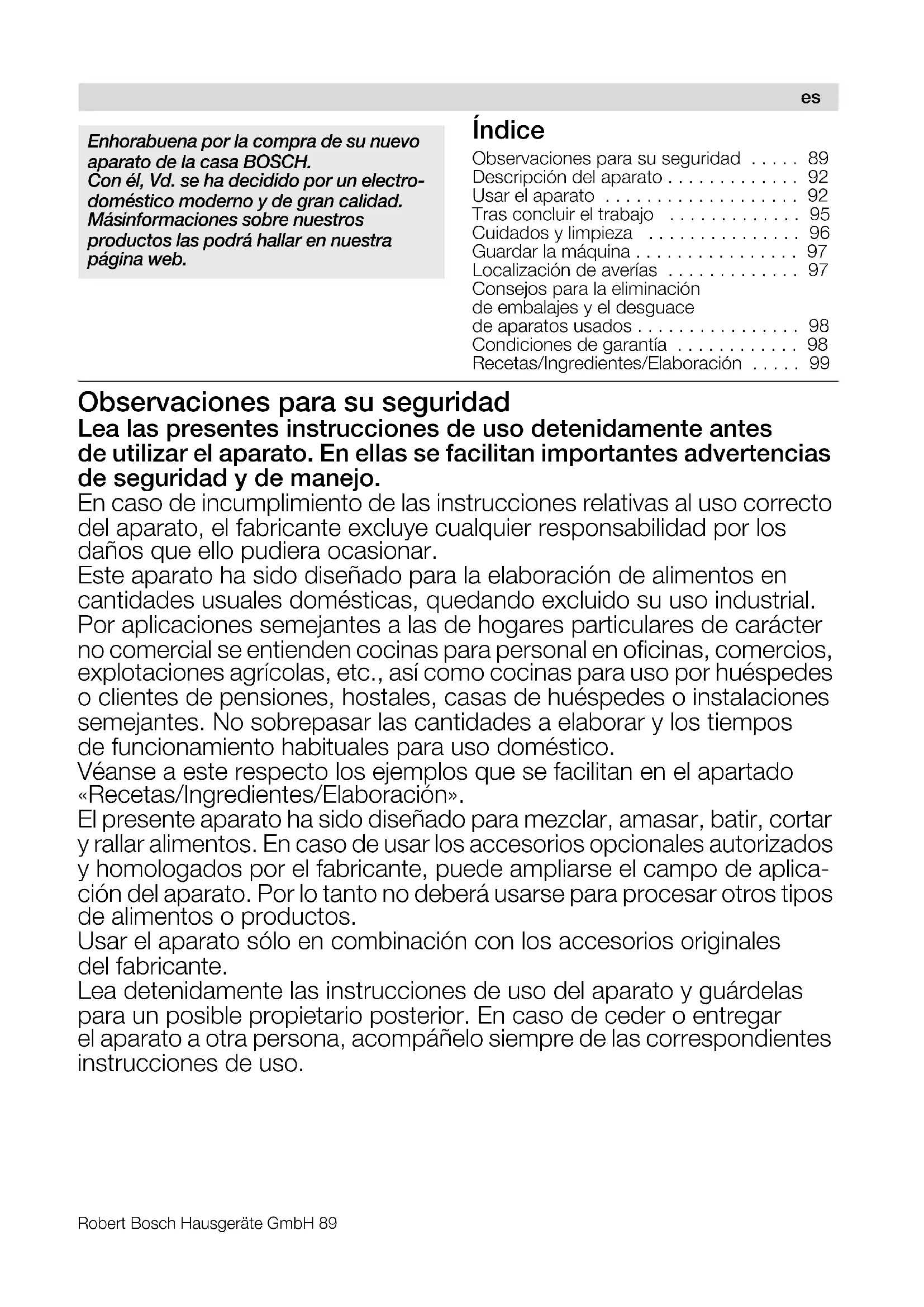 flmÉäáÖêç=ÇÉ=äÉëáçåÉë> flkç=~êã~ê=åìåÅ~=ä~=à~êê~=Ä~íáÇçê~=Éëí~åÇç= Éä î~ëç=ãçåí~Çç=Éå=Éä=~é~ê~íç> Advertencia Antes de usar el aparato, retirar todos los accesorios que se pudieran encontrar en el interior del recipiente de mezcla o en la jarra batidora. Montar sólo los accesorios que se vayan a usar. flmÉäáÖêç=ÇÉ=äÉëáçåÉë> ^åíÉë=ÇÉ=ÉÑÉÅíì~ê=Åì~äèìáÉê=íê~Ä~àç=Éå= Éä ~é~ê~íçI=Éñíê~Éê=Éä=Å~ÄäÉ=ÇÉ=ÅçåÉñáμå= ÇÉ ä~=íçã~=ÇÉ=ÅçêêáÉåíÉK Advertencia importante para los modelos MCM42.. En caso de manejo erróneo del aparato, dispararse el fusible electrónico o regis- trarse una avería en el aparato, el piloto de funcionamiento del aparato parpadea.98 Robert Bosch Hausgeräte GmbH Accesorios Avería: El aparato no se pone en marcha. Posible causa: El accesorio no está correctamente colocado. Forma de subsanarla: Colocar el mando giratorio en la posición 0/off. Colocar el accesorio de conformidad con las indicaciones de estas instruc- ciones de uso. Consejos para la eliminación de embalajes y el desguace de aparatos usados El presente aparato incorpora las marcas prescritas por la directiva europea CE/2012/19 relativa a la retirada y el reciclaje de los aparatos eléctricos y electrónicos usados (WEEE). Esta directiva constituye el marco reglamentario para una retirada y un reciclaje de los aparatos usados con validez para toda la Unión Europea. Solicite una información detallada y actual a este respecto a su distribuidor o Adminis- tración local. Condiciones de garantía CONDICIONES DE GARANTIA PAE BOSCH, se compromete a reparar o reponer de forma gratuita durante el período de 24 meses, a partir de la fecha de compra por el usuario final, las piezas cuyo defecto o falta de funcionamiento obedezca a causas de fabricación, así como la mano de obra necesaria para su reparación, siempre y cuando el aparato sea llevado por el usuario al taller del Servicio Técnico Autorizado por BOSCH. En el caso de que el usuario solicitara la visita del Técnico Autorizado a su domicilio para la reparación del aparato, estará obligado el usuario a pagar los gastos del desplazamiento. Esta garantía no incluye: lámparas, cristales, plásticos, ni piezas estéticas, reclamadas después del primer uso, ni averías producidas por causas ajenas a la fabricación o por uso no doméstico. Igualmente no están amparadas por esta garantía las averías o falta de funcionamiento producidas por causas no imputables al aparato (manejo inadecuado del mismo, limpiezas, voltajes e instalación incorrecta) o falta de seguimiento en las instrucciones de funciona- miento y mantenimiento que para cada aparato se incluyen en el folleto de instrucciones. Para la efectividad de esta garantía es imprescindible acreditar por parte del usuario y ante el Servicio Autorizado de BOSCH, la fecha de adquisición mediante la correspondiente FACTURA DE COMPRA o que el usuario acompañará con el aparato cuando ante la eventualidad de una avería lo tenga que llevar al Taller Autorizado. La intervención en el aparato por personal ajeno al Servicio Técnico Autorizado por BOSCH, significa la pérdida de garantía.