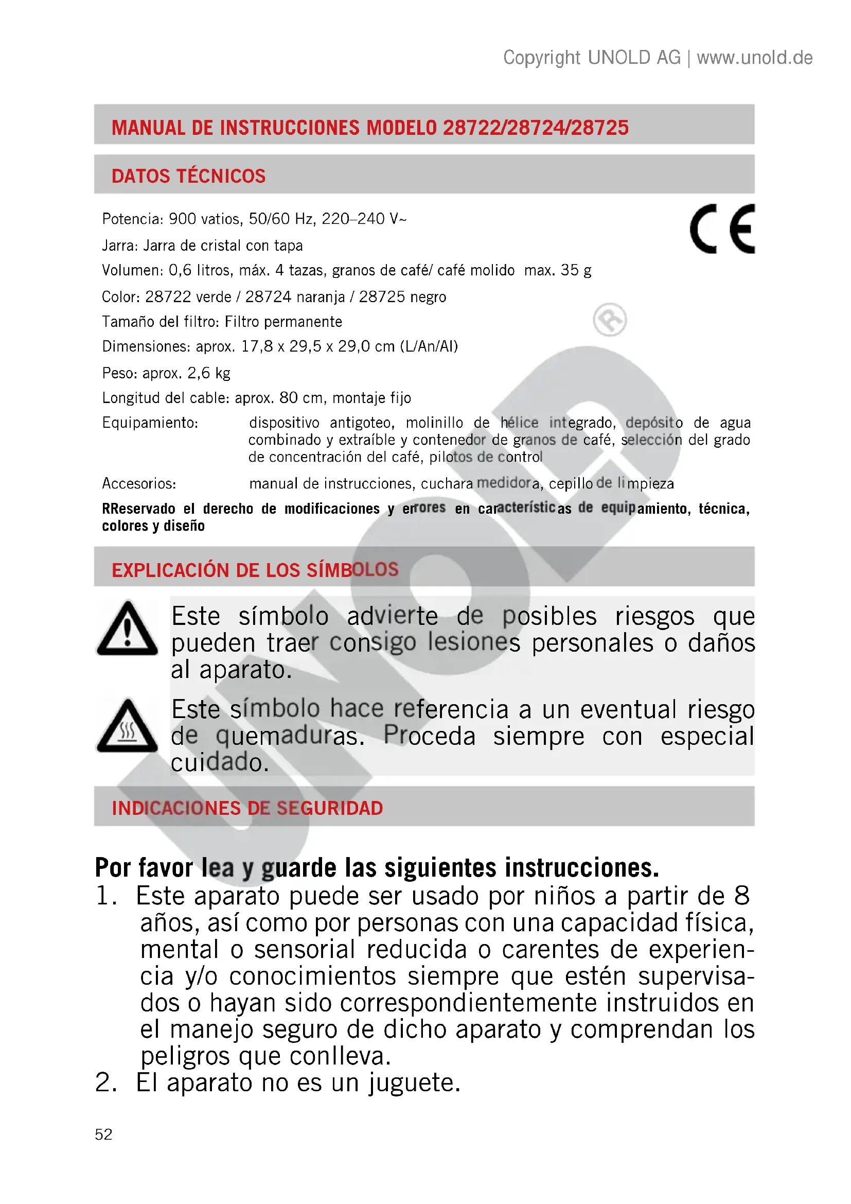 Este símbolo advierte de posibles riesgos que pueden traer consigo lesiones personales o daños al aparato. Este símbolo hace referencia a un eventual riesgo de quemaduras. Proceda siempre con especial cuidado. Potencia: 900 vatios, 50/60 Hz, 220–240 V~ Jarra: Jarra de cristal con tapa Volumen: 0,6 litros, máx. 4 tazas, granos de café/ café molido max. 35 g Color: 28722 verde / 28724 naranja / 28725 negro Tamaño del filtro: Filtro permanente Dimensiones: aprox. 17,8 x 29,5 x 29,0 cm (L/An/Al) Peso: aprox. 2,6 kg Longitud del cable: aprox. 80 cm, montaje fijo Equipamiento: dispositivo antigoteo, molinillo de hélice integrado, depósito de agua combinado y extraíble y contenedor de granos de café, selección del grado de concentración del café, pilotos de control Accesorios: manual de instrucciones, cuchara medidora, cepillo de limpieza RReservado el derecho de modificaciones y errores en características de equipamiento, técnica, colores y diseño Copyright UNOLD AG | www.unold.de53