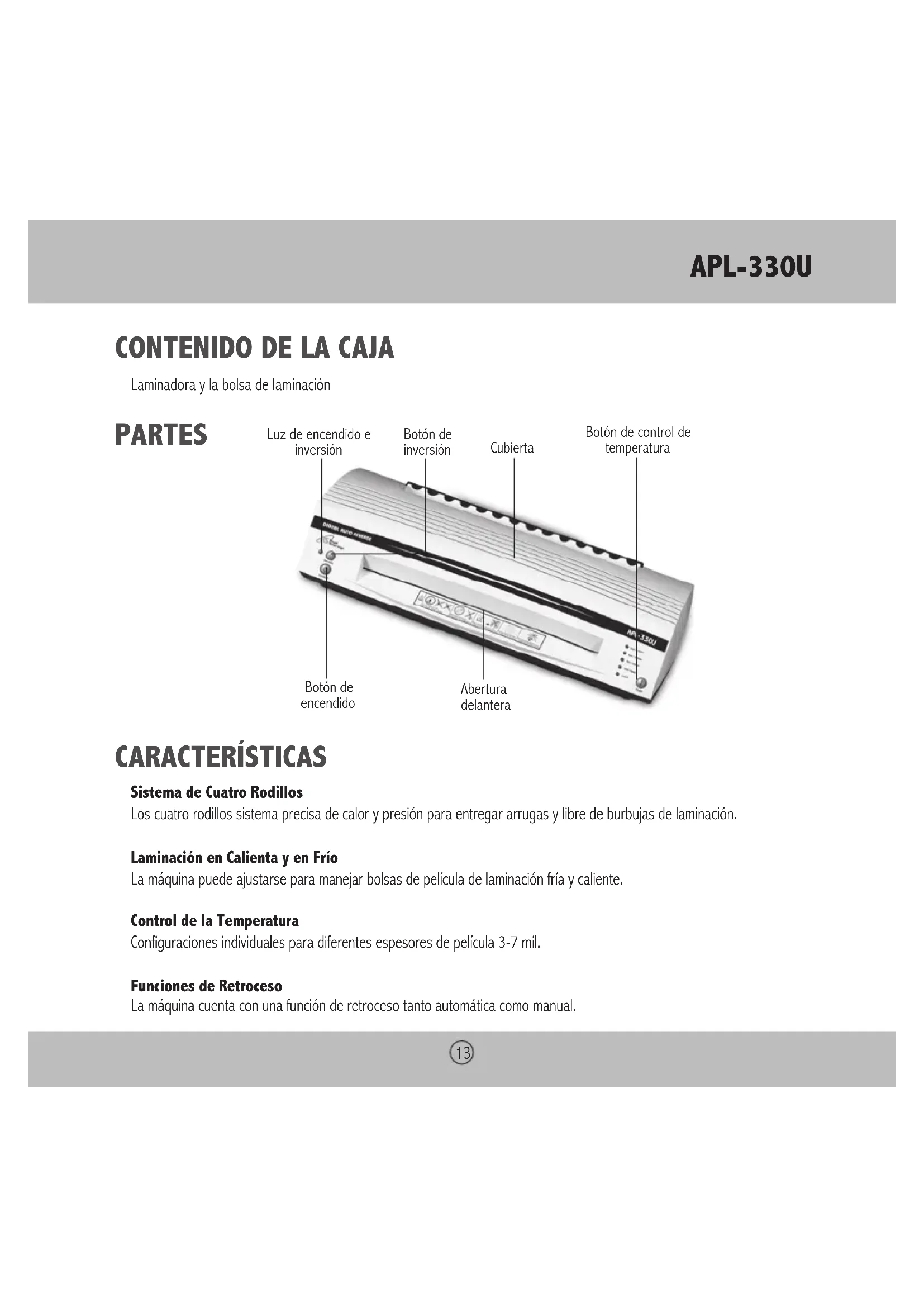 NOTA: Después de insertar la bolsa dentro del laminador, si el artículo a laminarse no pasa por los 4 rodillos durante los primeros 15 segundos, la función automática de retroceso se activará para regresar el artículo al frente de la máquina. Si requiere retroceder un artículo después de haberlo insertado en los rodillos oprima el botón de retroceso y el artículo saldrá por la puerta frontal.APL-330U