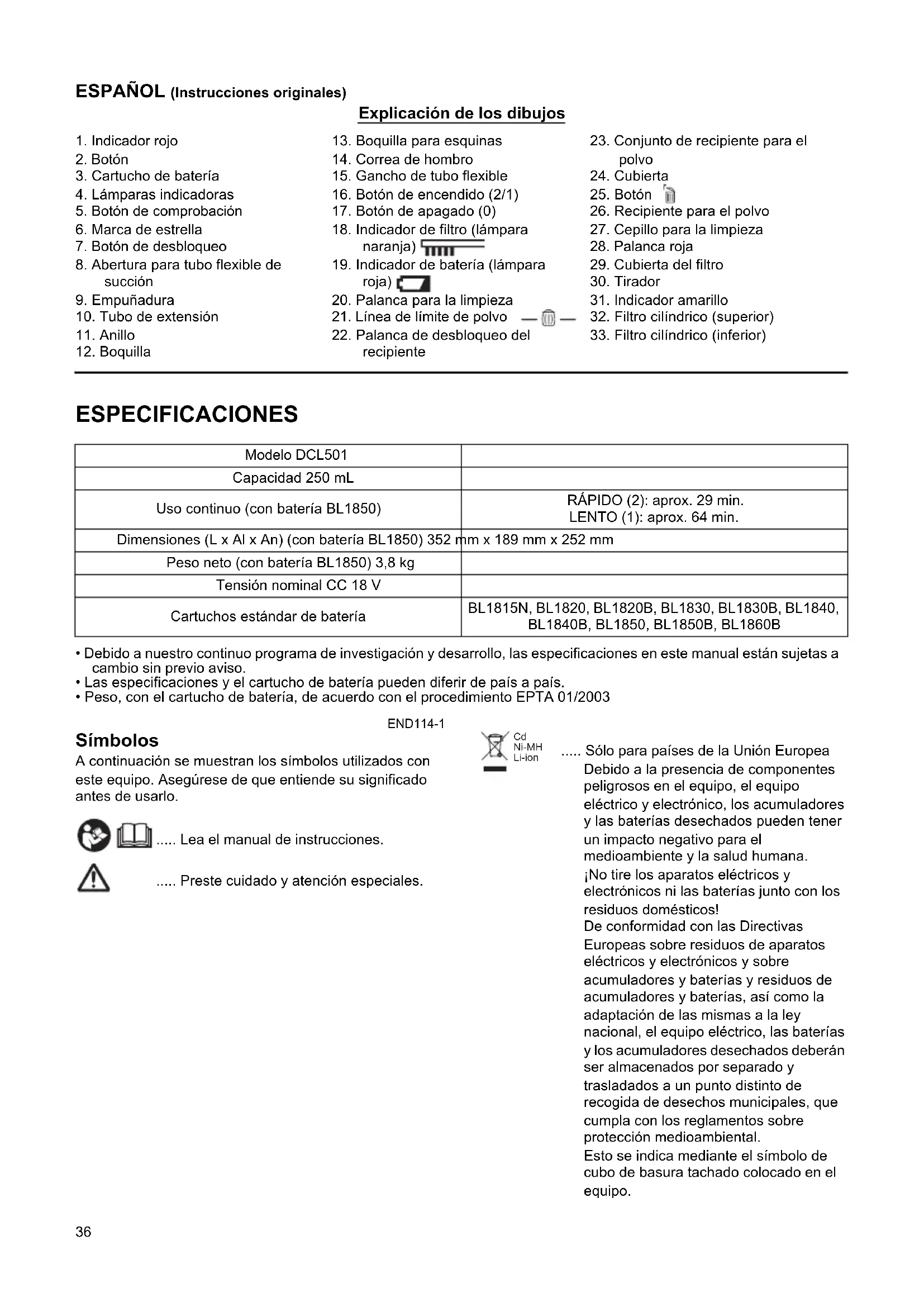 - Peso, con el cartucho de batería, de acuerdo con el procedimiento EPTA 01/2003 END114-1 Símbolos A continuación se muestran los símbolos utilizados con este equipo. Asegúrese de que entiende su significado antes de usarlo. ..... Lea el manual de instrucciones. ..... Preste cuidado y atención especiales. ..... Sólo para países de la Unión Europea Debido a la presencia de componentes peligrosos en el equipo, el equipo eléctrico y electrónico, los acumuladores y las baterías desechados pueden tener un impacto negativo para el medioambiente y la salud humana. ¡No tire los aparatos eléctricos y electrónicos ni las baterías junto con los residuos domésticos! De conformidad con las Directivas Europeas sobre residuos de aparatos eléctricos y electrónicos y sobre acumuladores y baterías y residuos de acumuladores y baterías, así como la adaptación de las mismas a la ley nacional, el equipo eléctrico, las baterías y los acumuladores desechados deberán ser almacenados por separado y trasladados a un punto distinto de recogida de desechos municipales, que cumpla con los reglamentos sobre protección medioambiental. Esto se indica mediante el símbolo de cubo de basura tachado colocado en el equipo.