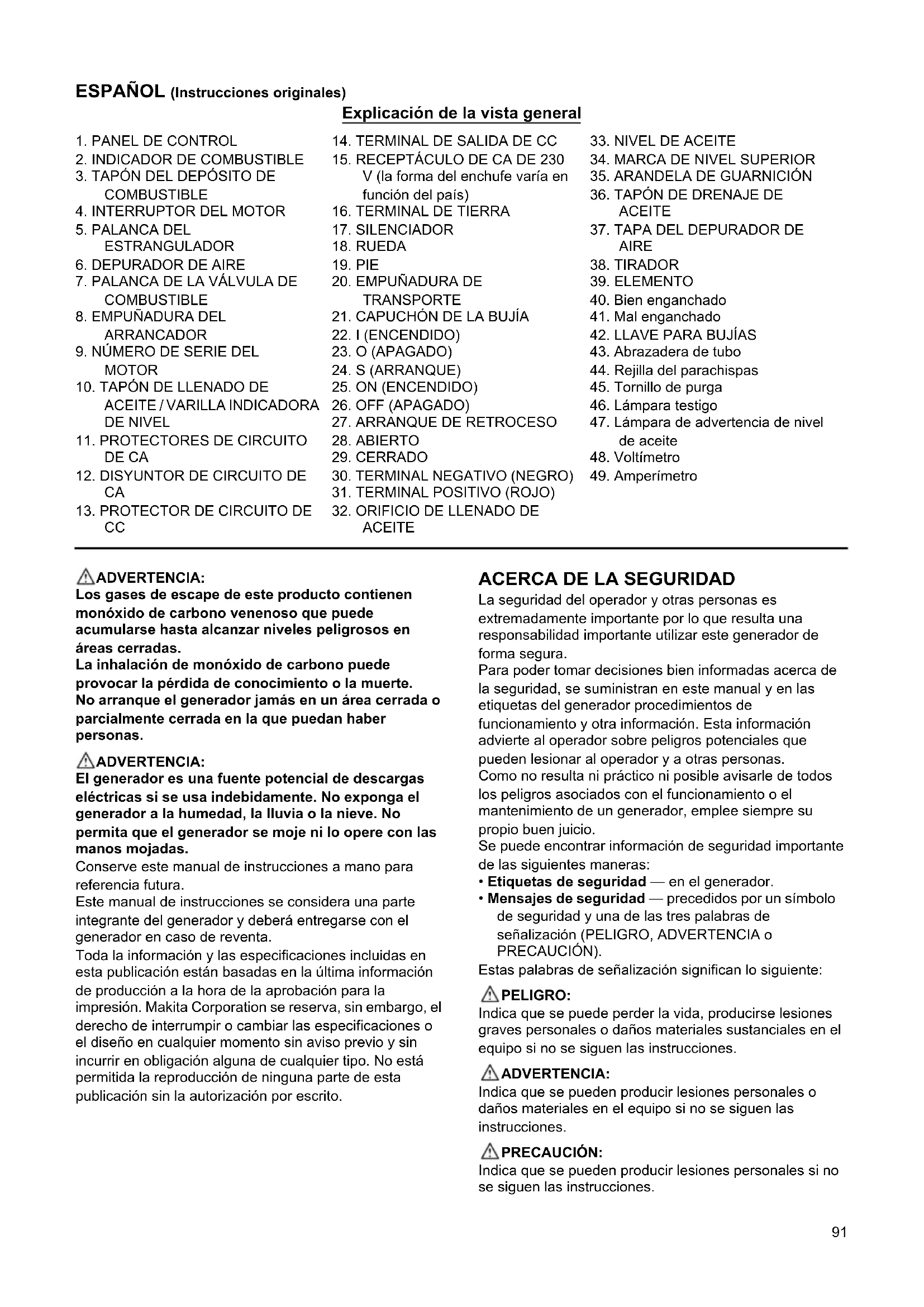 Tomoyasu Kato Director Makita Corporation 3-11-8, Sumiyoshi-cho, Anjo, Aichi, 446-8502, JAPAN91 ESPAÑOL (Instrucciones originales) Explicación de la vista general ADVERTENCIA: Los gases de escape de este producto contienen monóxido de carbono venenoso que puede acumularse hasta alcanzar niveles peligrosos en áreas cerradas. La inhalación de monóxido de carbono puede provocar la pérdida de conocimiento o la muerte. No arranque el generador jamás en un área cerrada o parcialmente cerrada en la que puedan haber personas. ADVERTENCIA: El generador es una fuente potencial de descargas eléctricas si se usa indebidamente. No exponga el generador a la humedad, la lluvia o la nieve. No permita que el generador se moje ni lo opere con las manos mojadas. Conserve este manual de instrucciones a mano para referencia futura. Este manual de instrucciones se considera una parte integrante del generador y deberá entregarse con el generador en caso de reventa. Toda la información y las especificaciones incluidas en esta publicación están basadas en la última información de producción a la hora de la aprobación para la impresión. Makita Corporation se reserva, sin embargo, el derecho de interrumpir o cambiar las especificaciones o el diseño en cualquier momento sin aviso previo y sin incurrir en obligación alguna de cualquier tipo. No está permitida la reproducción de ninguna parte de esta publicación sin la autorización por escrito.