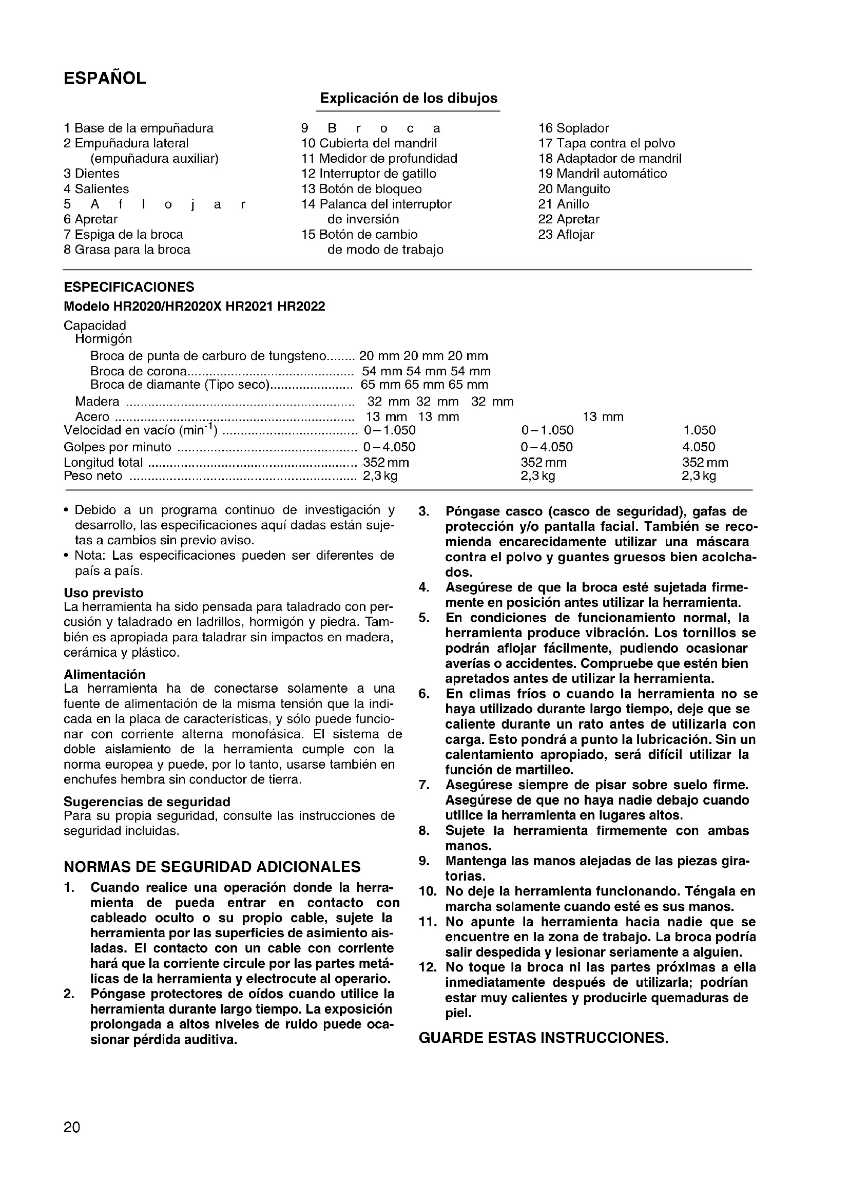- Nunca use “rotación con martilleo” cuando el conjunto del mandril esté instalado en la herramienta. El con- junto del mandril podría estropearse. Además, el mandril podría desprenderse al girar al revés la herramienta. (Para HR2020 y HR2020X)