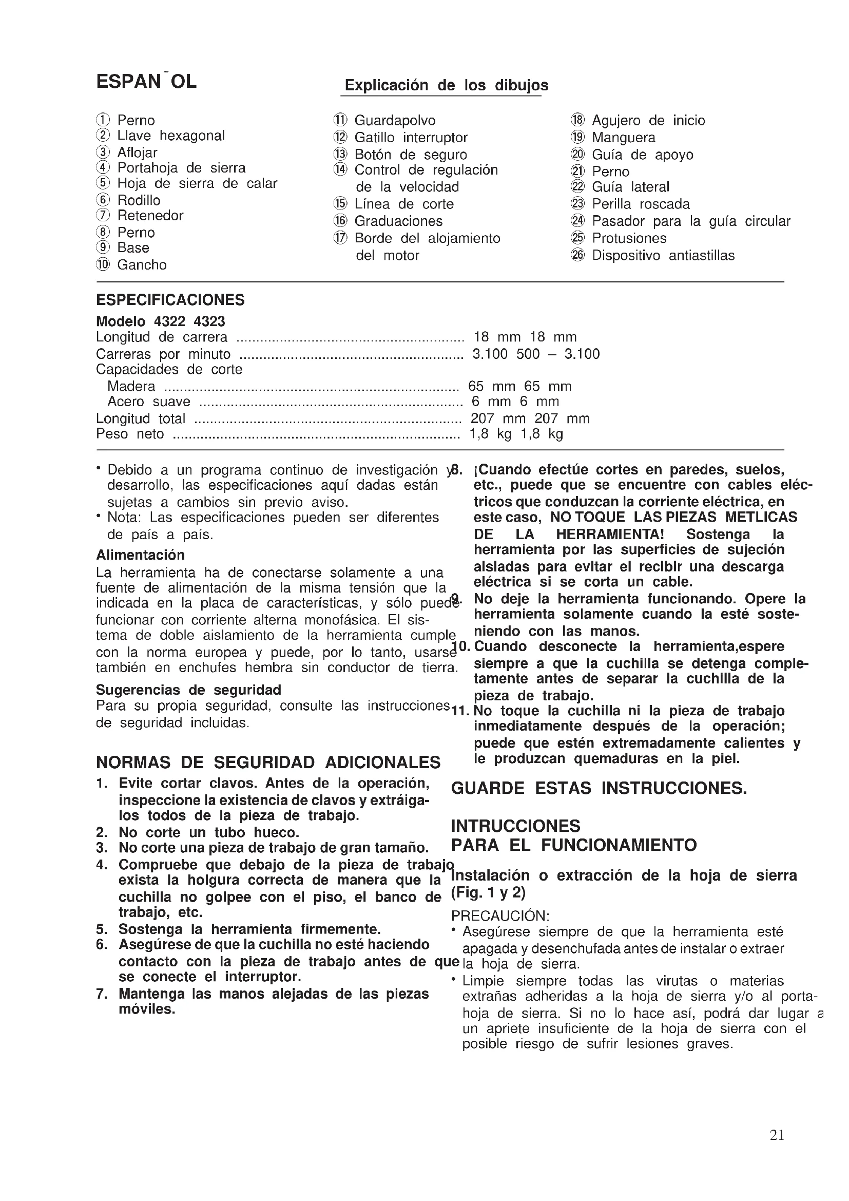 - Cuando corte círculos o arcos de 170 mm o menos de radio, instale la guía de apoyo de la siguiente forma. Inserte la guía de apoyo en el orificio rectangular situado en el costado de la base de la herramienta con la guía lateral mirando hacia arriba. Inserte el pasador de la guía circular en uno de los dos orificios de la guía lateral. Rosque la perilla ros- cada en el pasador para sujetar el pasador. Ahora deslice la guía de apoyo hasta el radio de corte deseado, y apriete el perno para sujetarla en esa posición. Luego mueva la base de la herramienta completamente hacia delante. Dispositivo antiastillas (accesorio opcional) (Fig. 21) Para realizar cortes sin astillar la pieza de trabajo, puede utilizarse el dispositivos antiastillas. Para insta- larlo, desplace completamente hacia adelante la base de la herramienta e insértelo entre las dos protu- siones de la base de la herramienta. PRECAUCIÓN: Cuando haga cortes en bisel no podrá utilizar el dispositivo antiastillas. MANTENIMIENTO PRECAUCIOu N: Asegu´rese siempre de que la herramienta esté des- conectada y desenchufada antes de realizar ninguna reparacio´n en ella. Para mantener la seguridad y fiabilidad del producto, las reparaciones, el mantenimiento y los ajustes deberán ser realizados por un Centro de Servicio Autorizado de Makita. GARANTIuA Las herramientas de Makita quedan garantizadas en conformidad con las regulaciones específicas de las leyes vigentes/países. Los daños imputables a des- gaste y roturas normales, a sobrecargaoaunmanejo indebido de las herramientas quedan excluidos de la garantía. En caso de reclamación, se ruega enviar la herramienta, sin desmontarla y con el CERTIFICADO DE GARANTIuA adjunto, al distribuidor de la localidad o al Centro de Servicio Makita. 4322/4323 (Sp) (’98. 1. 22) 23PORTUGUÊS Explicaça˜o geral 1 Perno 2 Chave hexagonal 3 Libertar 4 Suporte da lâmina 5 Lâmina da serra de vaivém 6 Cilindro 7 Suporte 8 Perno 9 Base 0 Gancho q Cobertura contra o pó w Gatilho de interruptor e Botão de bloqueio r Marcador de regulação de velocidade t Linha de corte y Graduações u Extremidade do alojamento do motor i Orifício de início o Mangueira p Vedação para escarificação a Perno s Vedação guia d Botão roscado f Haste para a guia circular g Protuberância h Mecanismo de anti-fragmentação ESPECIFICAÇOx ES Modelo 4322 4323 Comprimento do corte p. 18