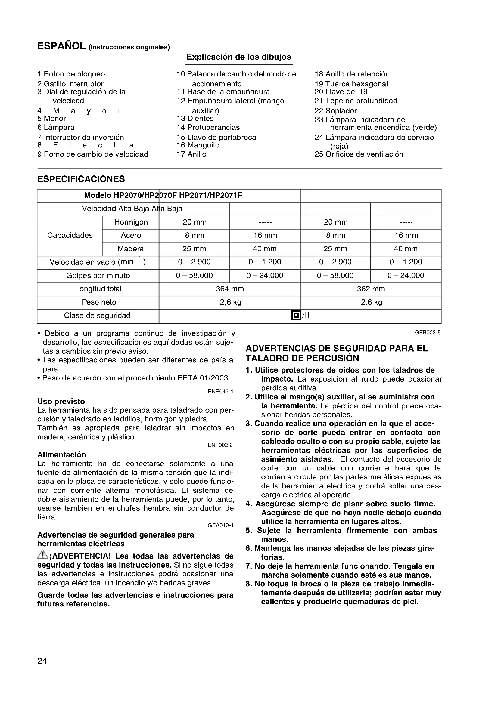 - Peso de acuerdo con el procedimiento EPTA 01/2003 ENE042-1 Uso previsto La herramienta ha sido pensada para taladrado con per- cusión y taladrado en ladrillos, hormigón y piedra. También es apropiada para taladrar sin impactos en madera, cerámica y plástico. ENF002-2 Alimentación La herramienta ha de conectarse solamente a una fuente de alimentación de la misma tensión que la indi- cada en la placa de características, y sólo puede funcio- nar con corriente alterna monofásica. El sistema de doble aislamiento de la herramienta puede, por lo tanto, usarse también en enchufes hembra sin conductor de tierra. GEA010-1 Advertencias de seguridad generales para herramientas eléctricas ¡ADVERTENCIA! Lea todas las advertencias de seguridad y todas las instrucciones. Si no sigue todas las advertencias e instrucciones podrá ocasionar una descarga eléctrica, un incendio y/o heridas graves. Guarde todas las advertencias e instrucciones para futuras referencias. GEB003-5