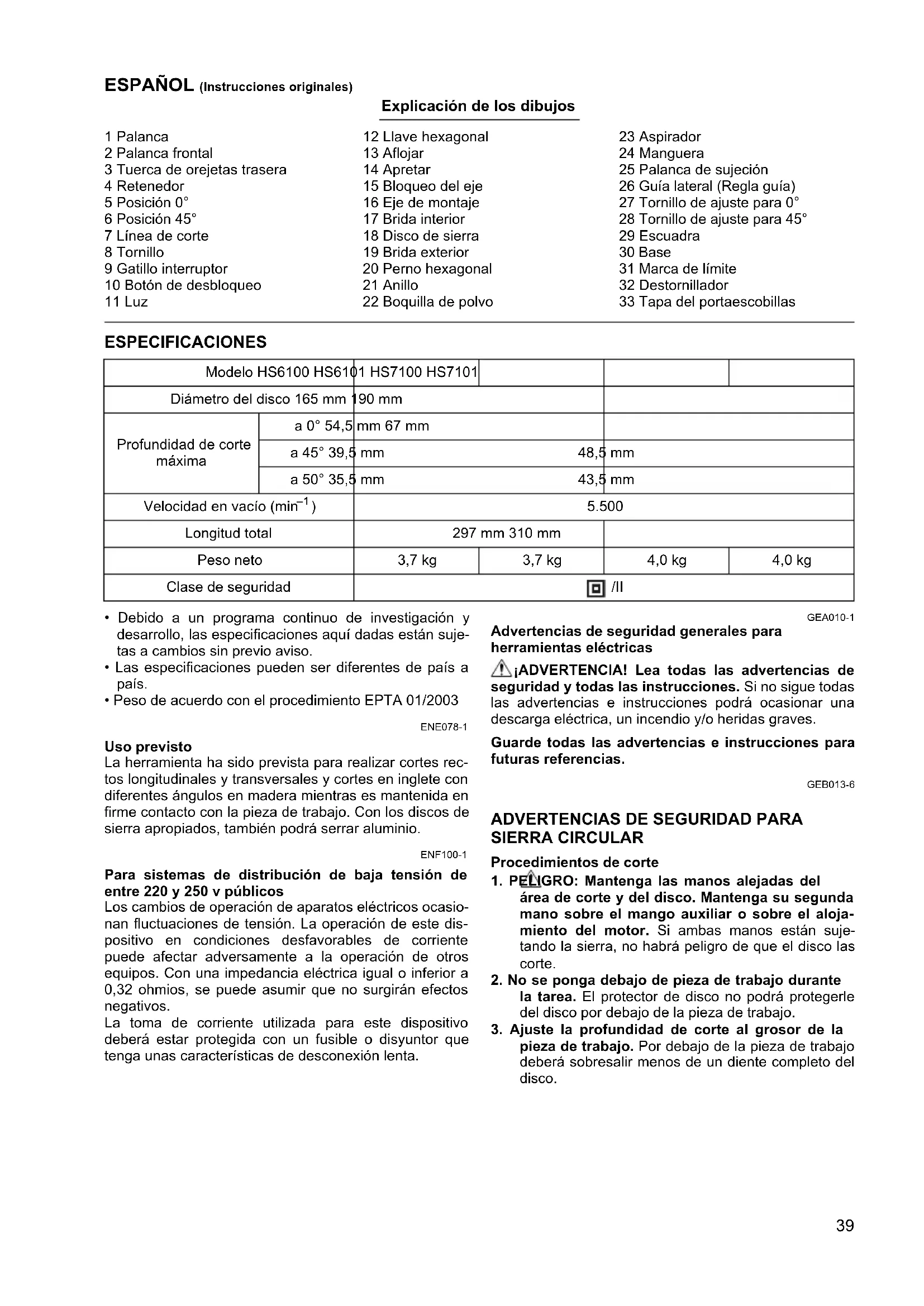 - Peso de acuerdo con el procedimiento EPTA 01/2003 ENE078-1 Uso previsto La herramienta ha sido prevista para realizar cortes rec- tos longitudinales y transversales y cortes en inglete con diferentes ángulos en madera mientras es mantenida en firme contacto con la pieza de trabajo. Con los discos de sierra apropiados, también podrá serrar aluminio. ENF100-1 Para sistemas de distribución de baja tensión de entre 220 y 250 v públicos Los cambios de operación de aparatos eléctricos ocasio- nan fluctuaciones de tensión. La operación de este dis- positivo en condiciones desfavorables de corriente puede afectar adversamente a la operación de otros equipos. Con una impedancia eléctrica igual o inferior a 0,32 ohmios, se puede asumir que no surgirán efectos negativos. La toma de corriente utilizada para este dispositivo deberá estar protegida con un fusible o disyuntor que tenga unas características de desconexión lenta. GEA010-1 Advertencias de seguridad generales para herramientas eléctricas ¡ADVERTENCIA! Lea todas las advertencias de seguridad y todas las instrucciones. Si no sigue todas las advertencias e instrucciones podrá ocasionar una descarga eléctrica, un incendio y/o heridas graves. Guarde todas las advertencias e instrucciones para futuras referencias. GEB013-6