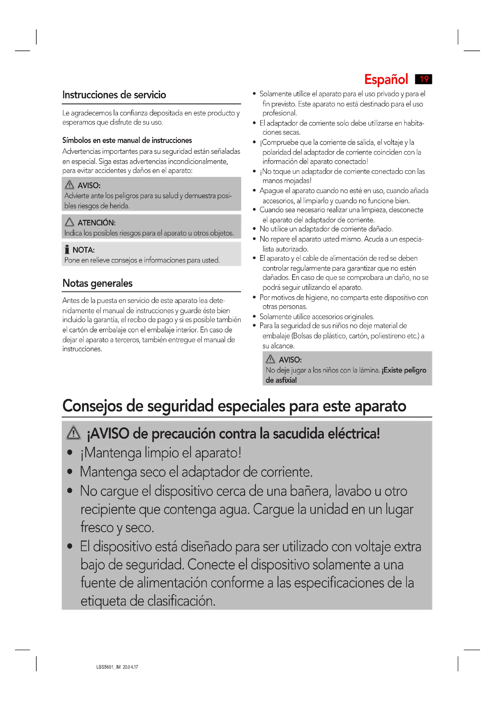 LBS5691_IM 20.0 4.17 Instrucciones de servicio Le agradecemos la confianza depositada en este producto y esperamos que disfrute de su uso.Símbolos en este manual de instruccionesAdvertencias importantes para su seguridad están señaladas en especial. Siga estas advertencias incondicionalmente, para evitar accidentes y daños en el aparato: AVISO:Advierte ante los peligros para su salud y demuestra posi-bles riesgos de herida. ATENCIÓN:Indica los posibles riesgos para el aparato u otros objetos. NOTA:Pone en relieve consejos e informaciones para usted. Notas generales Antes de la puesta en servicio de este aparato lea dete-nidamente el manual de instrucciones y guarde éste bien incluido la garantía, el recibo de pago y si es posible también el cartón de embalaje con el embalaje interior. En caso de dejar el aparato a terceros, también entregue el manual de instrucciones.• Solamente utilice el aparato para el uso privado y para el fin previsto. Este aparato no está destinado para el uso profesional.• El adaptador de corriente solo debe utilizarse en habita-ciones secas.• ¡Compruebe que la corriente de salida, el voltaje y la polaridad del adaptador de corriente coinciden con la información del aparato conectado!• ¡No toque un adaptador de corriente conectado con las manos mojadas!• Apague el aparato cuando no esté en uso, cuando añada accesorios, al limpiarlo y cuando no funcione bien.• Cuando sea necesario realizar una limpieza, desconecte el aparato del adaptador de corriente.• No utilice un adaptador de corriente dañado.• No repare el aparato usted mismo. Acuda a un especia-lista autorizado.• El aparato y el cable de alimentación de red se deben controlar regularmente para garantizar que no estén dañados. En caso de que se comprobara un daño, no se podrá seguir utilizando el aparato.• Por motivos de higiene, no comparta este dispositivo con otras personas.• Solamente utilice accesorios originales.• Para la seguridad de sus niños no deje material de embalaje (Bolsas de plástico, cartón, poliestireno etc.) a su alcance. AVISO:No deje jugar a los niños con la lámina. ¡Existe peligro de asfixia! Consejos de seguridad especiales para este aparato ¡AVISO de precaución contra la sacudida eléctrica!