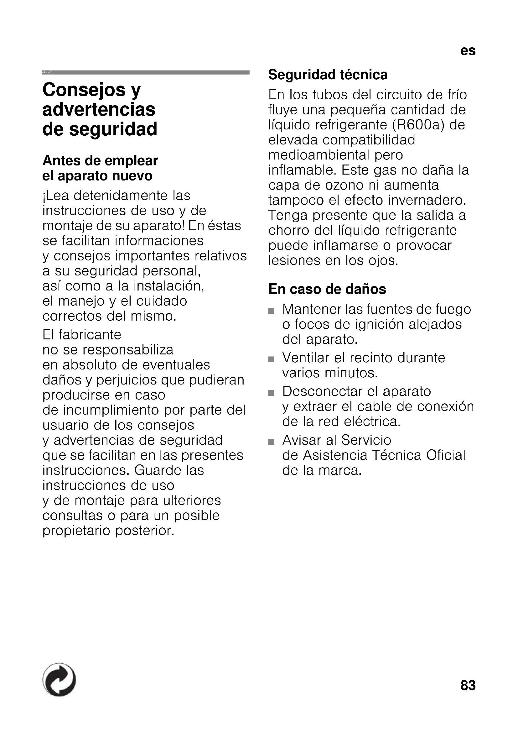 esÍndice esInstrucciones de uso Consejos y advertencias de seguridad Antes de emplear el aparato nuevo ¡Lea detenidamente las instrucciones de uso y de montaje de su aparato! En éstas se facilitan informaciones y consejos importantes relativos a su seguridad personal, así como a la instalación, el manejo y el cuidado correctos del mismo. El fabricante no se responsabiliza en absoluto de eventuales daños y perjuicios que pudieran producirse en caso de incumplimiento por parte del usuario de los consejos y advertencias de seguridad que se facilitan en las presentes instrucciones. Guarde las instrucciones de uso y de montaje para ulteriores consultas o para un posible propietario posterior. Seguridad técnica En los tubos del circuito de frío fluye una pequeña cantidad de líquido refrigerante (R600a) de elevada compatibilidad medioambiental pero inflamable. Este gas no daña la capa de ozono ni aumenta tampoco el efecto invernadero. Tenga presente que la salida a chorro del líquido refrigerante puede inflamarse o provocar lesiones en los ojos. En caso de daños ■ Mantener las fuentes de fuego o focos de ignición alejados del aparato. ■ Ventilar el recinto durante varios minutos. ■ Desconectar el aparato y extraer el cable de conexión de la red eléctrica. ■ Avisar al Servicio de Asistencia Técnica Oficial de la marca.es