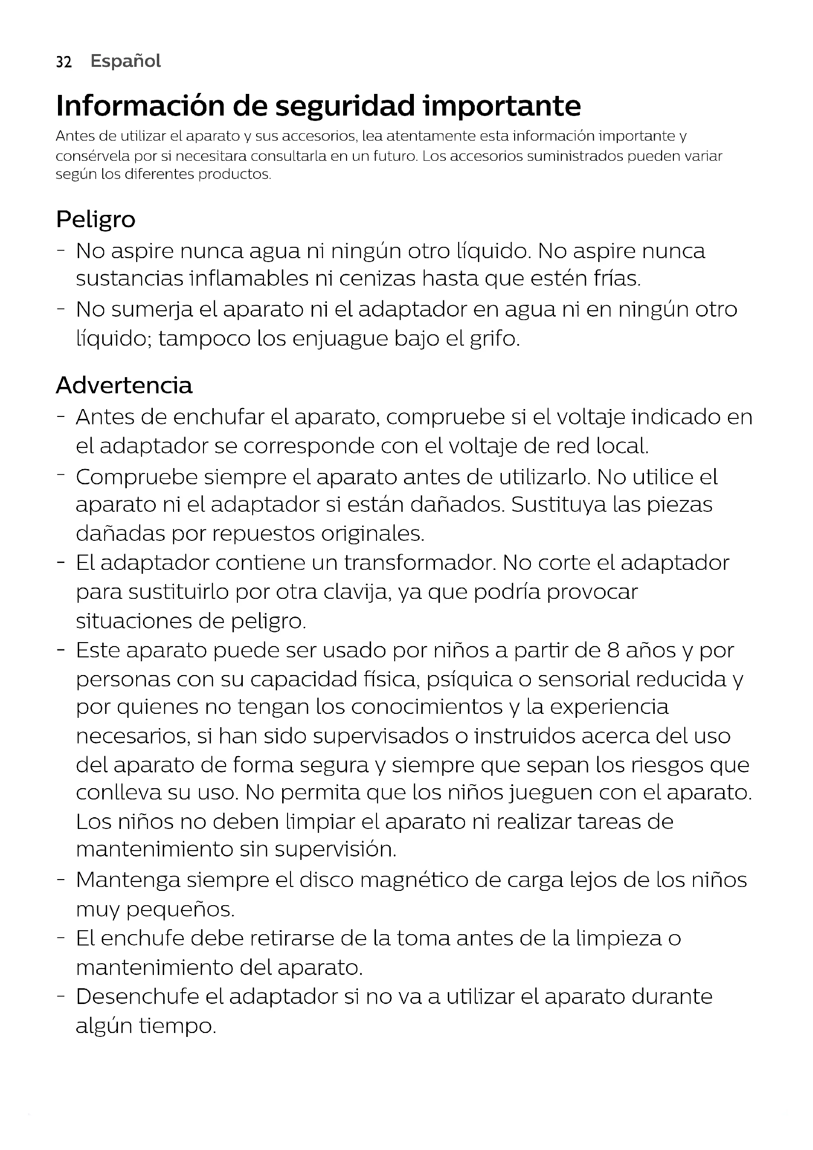 No aspire nunca agua ni ningún otro líquido. No aspire nunca sustancias inflamables ni cenizas hasta que estén frías.
