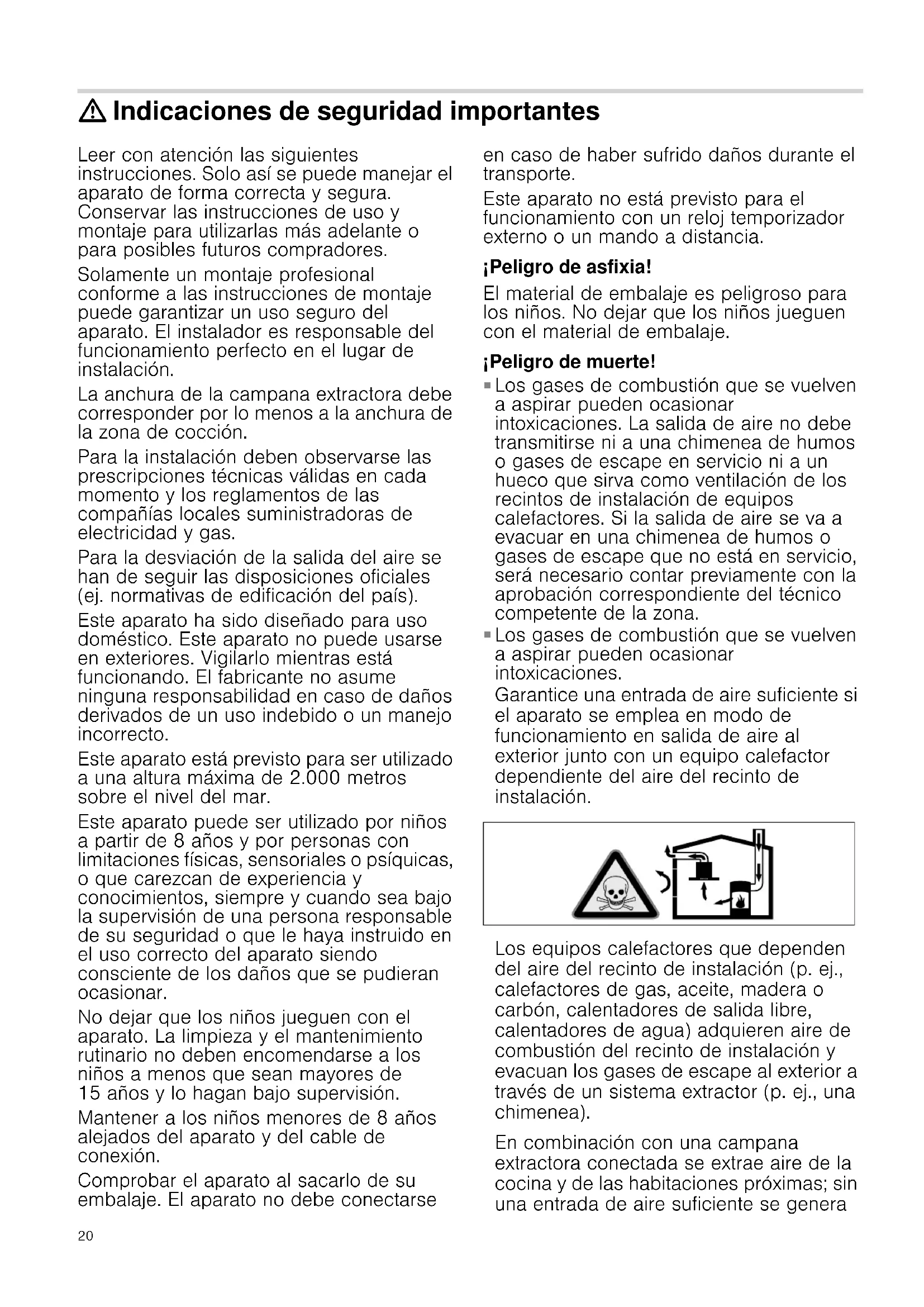: Indicaciones de seguridad importantes Leer con atención las siguientes instrucciones. Solo así se puede manejar el aparato de forma correcta y segura. Conservar las instrucciones de uso y montaje para utilizarlas más adelante o para posibles futuros compradores. Solamente un montaje profesional conforme a las instrucciones de montaje puede garantizar un uso seguro del aparato. El instalador es responsable del funcionamiento perfecto en el lugar de instalación. La anchura de la campana extractora debe corresponder por lo menos a la anchura de la zona de cocción. Para la instalación deben observarse las prescripciones técnicas válidas en cada momento y los reglamentos de las compañías locales suministradoras de electricidad y gas. Para la desviación de la salida del aire se han de seguir las disposiciones oficiales (ej. normativas de edificación del país). Este aparato ha sido diseñado para uso doméstico. Este aparato no puede usarse en exteriores. Vigilarlo mientras está funcionando. El fabricante no asume ninguna responsabilidad en caso de daños derivados de un uso indebido o un manejo incorrecto. Este aparato está previsto para ser utilizado a una altura máxima de 2.000 metros sobre el nivel del mar. Este aparato puede ser utilizado por niños a partir de 8 años y por personas con limitaciones físicas, sensoriales o psíquicas, o que carezcan de experiencia y conocimientos, siempre y cuando sea bajo la supervisión de una persona responsable de su seguridad o que le haya instruido en el uso correcto del aparato siendo consciente de los daños que se pudieran ocasionar. No dejar que los niños jueguen con el aparato. La limpieza y el mantenimiento rutinario no deben encomendarse a los niños a menos que sean mayores de 15 años y lo hagan bajo supervisión. Mantener a los niños menores de 8 años alejados del aparato y del cable de conexión. Comprobar el aparato al sacarlo de su embalaje. El aparato no debe conectarse en caso de haber sufrido daños durante el transporte. Este aparato no está previsto para el funcionamiento con un reloj temporizador externo o un mando a distancia. ¡Peligro de asfixia! El material de embalaje es peligroso para los niños. No dejar que los niños jueguen con el material de embalaje. ¡Peligro de muerte!