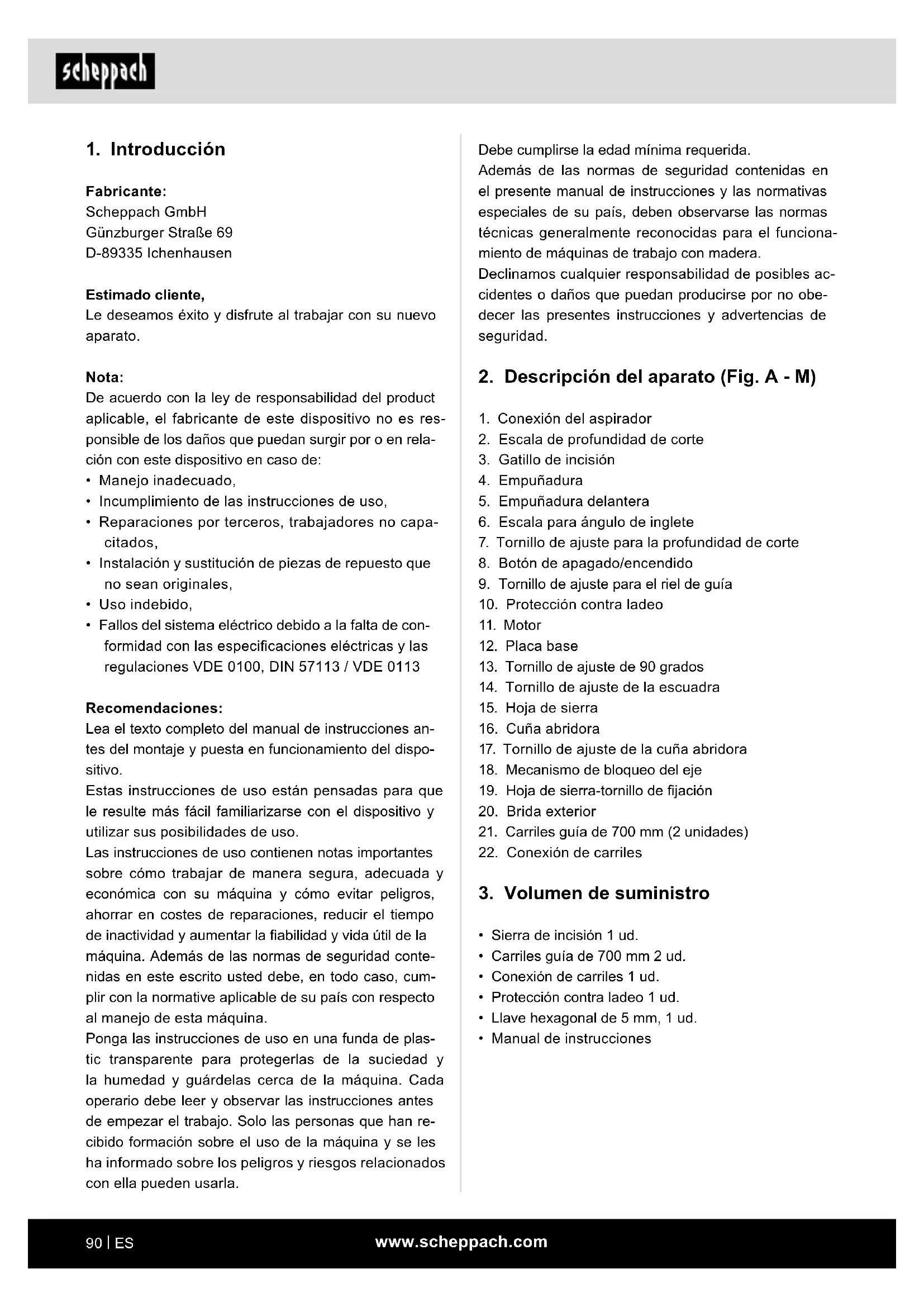 Fabricante: Scheppach GmbH Günzburger Straße 69 D-89335 Ichenhausen Estimado cliente, Le deseamos éxito y disfrute al trabajar con su nuevo aparato. Nota: De acuerdo con la ley de responsabilidad del product aplicable, el fabricante de este dispositivo no es res- ponsible de los daños que puedan surgir por o en rela- ción con este dispositivo en caso de: