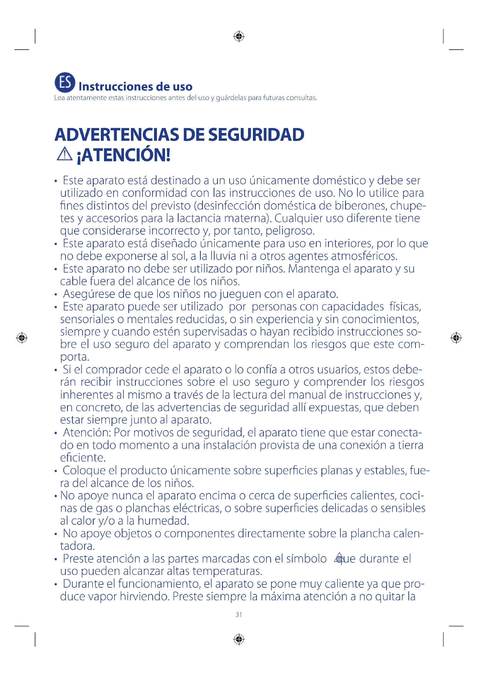 - Este aparato está destinado a un uso únicamente doméstico y debe ser utilizado en conformidad con las instrucciones de uso. No lo utilice para nes distintos del previsto (desinfección doméstica de biberones, chupe- tes y accesorios para la lactancia materna). Cualquier uso diferente tiene que considerarse incorrecto y, por tanto, peligroso.