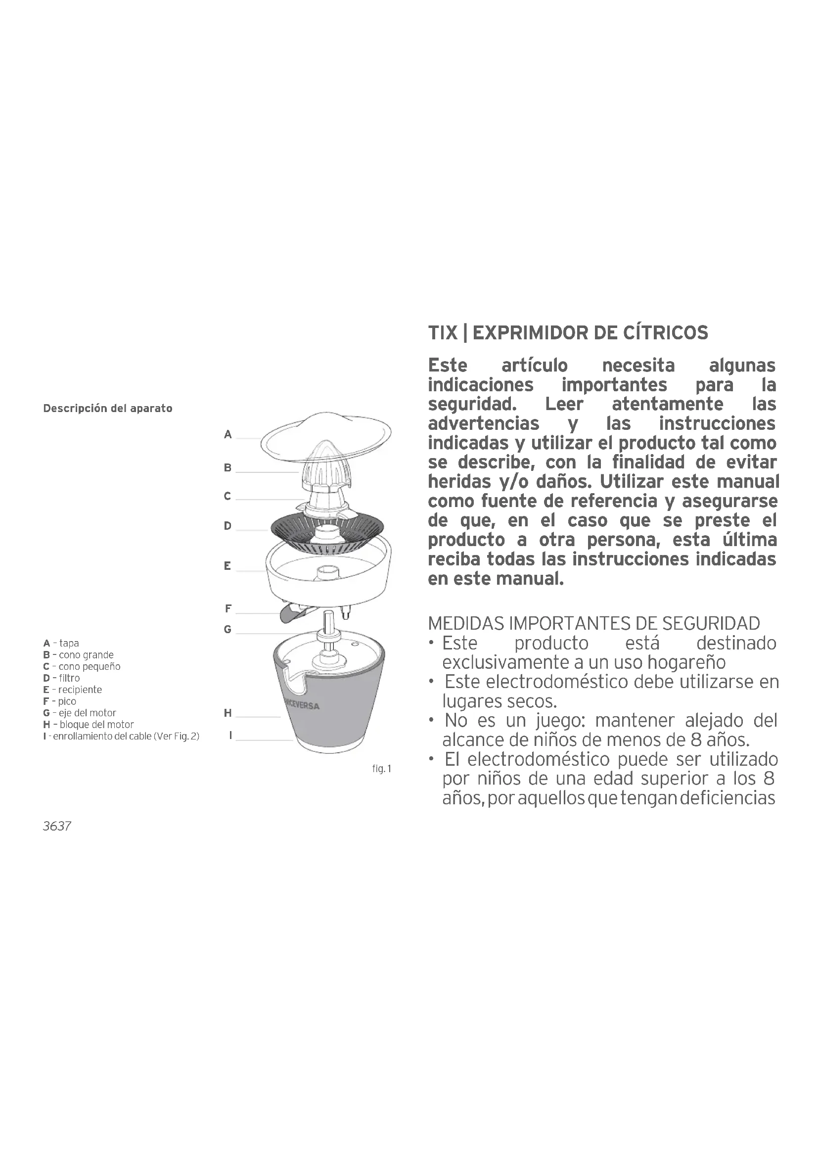 - No utiliser el exprimidor de citricos si el aparato o el cable principal muestra evidentes senales de daños, pero tampoco en el caso de que el exprimidor de citricos se haya sido caer.