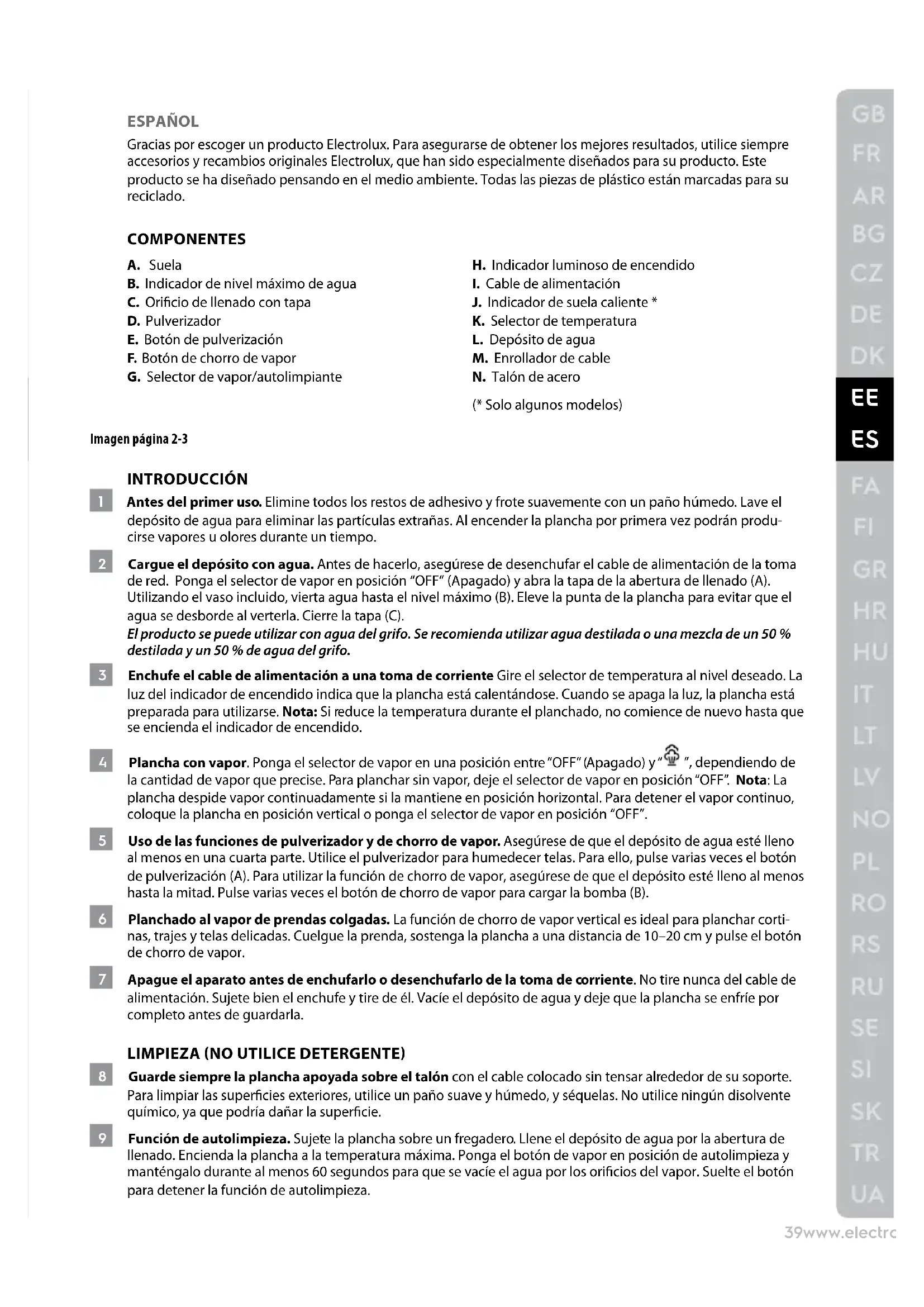 J. Indicador de suela caliente * K. Selector de temperatura L. Depósito de agua M. Enrollador de cable N. Talón de acero (* Solo algunos modelos) Imagen página 2-3 INTRODUCCIÓN 1 Antes del primer uso. Elimine todos los restos de adhesivo y frote suavemente con un paño húmedo. Lave el depósito de agua para eliminar las partículas extrañas. Al encender la plancha por primera vez podrán produ- cirse vapores u olores durante un tiempo. 2 Cargue el depósito con agua. Antes de hacerlo, asegúrese de desenchufar el cable de alimentación de la toma de red. Ponga el selector de vapor en posición “OFF” (Apagado) y abra la tapa de la abertura de llenado (A). Utilizando el vaso incluido, vierta agua hasta el nivel máximo (B). Eleve la punta de la plancha para evitar que el agua se desborde al verterla. Cierre la tapa (C). El producto se puede utilizar con agua del grifo. Se recomienda utilizar agua destilada o una mezcla de un 50 % destilada y un 50 % de agua del grifo. 3 Enchufe el cable de alimentación a una toma de corriente Gire el selector de temperatura al nivel deseado. La luz del indicador de encendido indica que la plancha está calentándose. Cuando se apaga la luz, la plancha está preparada para utilizarse. Nota: Si reduce la temperatura durante el planchado, no comience de nuevo hasta que se encienda el indicador de encendido. 4 Plancha con vapor. Ponga el selector de vapor en una posición entre “OFF” (Apagado) y “ ”, dependiendo de la cantidad de vapor que precise. Para planchar sin vapor, deje el selector de vapor en posición “OFF”. Nota: La plancha despide vapor continuadamente si la mantiene en posición horizontal. Para detener el vapor continuo, coloque la plancha en posición vertical o ponga el selector de vapor en posición “OFF”. 5 Uso de las funciones de pulverizador y de chorro de vapor. Asegúrese de que el depósito de agua esté lleno al menos en una cuarta parte. Utilice el pulverizador para humedecer telas. Para ello, pulse varias veces el botón de pulverización (A). Para utilizar la función de chorro de vapor, asegúrese de que el depósito esté lleno al menos hasta la mitad. Pulse varias veces el botón de chorro de vapor para cargar la bomba (B). 6 Planchado al vapor de prendas colgadas. La función de chorro de vapor vertical es ideal para planchar corti- nas, trajes y telas delicadas. Cuelgue la prenda, sostenga la plancha a una distancia de 10–20 cm y pulse el botón de chorro de vapor. 7 Apague el aparato antes de enchufarlo o desenchufarlo de la toma de corriente. No tire nunca del cable de alimentación. Sujete bien el enchufe y tire de él. Vacíe el depósito de agua y deje que la plancha se enfríe por completo antes de guardarla. LIMPIEZA (NO UTILICE DETERGENTE) 8 Guarde siempre la plancha apoyada sobre el talón con el cable colocado sin tensar alrededor de su soporte. Para limpiar las supercies exteriores, utilice un paño suave y húmedo, y séquelas. No utilice ningún disolvente químico, ya que podría dañar la supercie. 9 Función de autolimpieza. Sujete la plancha sobre un fregadero. Llene el depósito de agua por la abertura de llenado. Encienda la plancha a la temperatura máxima. Ponga el botón de vapor en posición de autolimpieza y manténgalo durante al menos 60 segundos para que se vacíe el agua por los oricios del vapor. Suelte el botón para detener la función de autolimpieza.40www.electrolux.com 10 Limpieza de la suela. No utilice limpiadores potentes ni estropajos que pudiesen rayar la supercie de la suela. Para eliminar los residuos de quemaduras, planche sobre un paño húmedo mientras la plancha todavía esté caliente. Para limpiar la suela, utilice un paño suave y húmedo, y séquela. THERMOSAFE™ (* SOLO ALGUNOS MODELOS) 11 Su plancha viene equipada con un indicador de suela caliente ThermoSafe™ que detecta si la suela está cali- ente y cambia el color de negro a rojo. Una vez que la temperatura de la base es inferior a 40C°, el color vuelve a cambiar a negro para indicar que la plancha puede volver a guardarse. ¡Disfrute de su nuevo producto Electrolux!