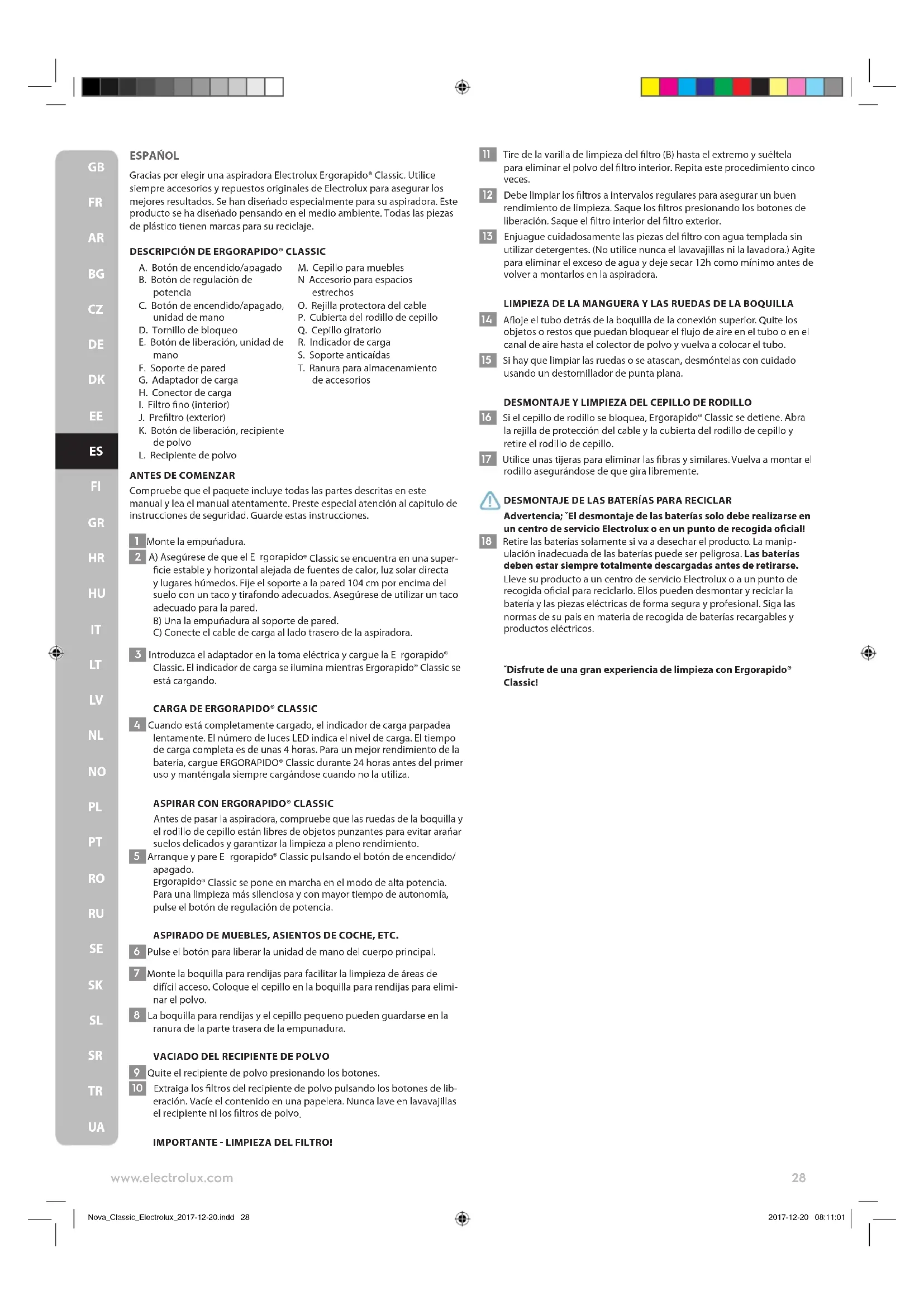 Nova_Classic_Electrolux_2017-12-20.indd 27 2017-12-20 08:11:01ESPAŃOL Gracias por elegir una aspiradora Electrolux Ergorapido® Classic. Utilice siempre accesorios y repuestos originales de Electrolux para asegurar los mejores resultados. Se han diseńado especialmente para su aspiradora. Este producto se ha diseńado pensando en el medio ambiente. Todas las piezas de plástico tienen marcas para su reciclaje.