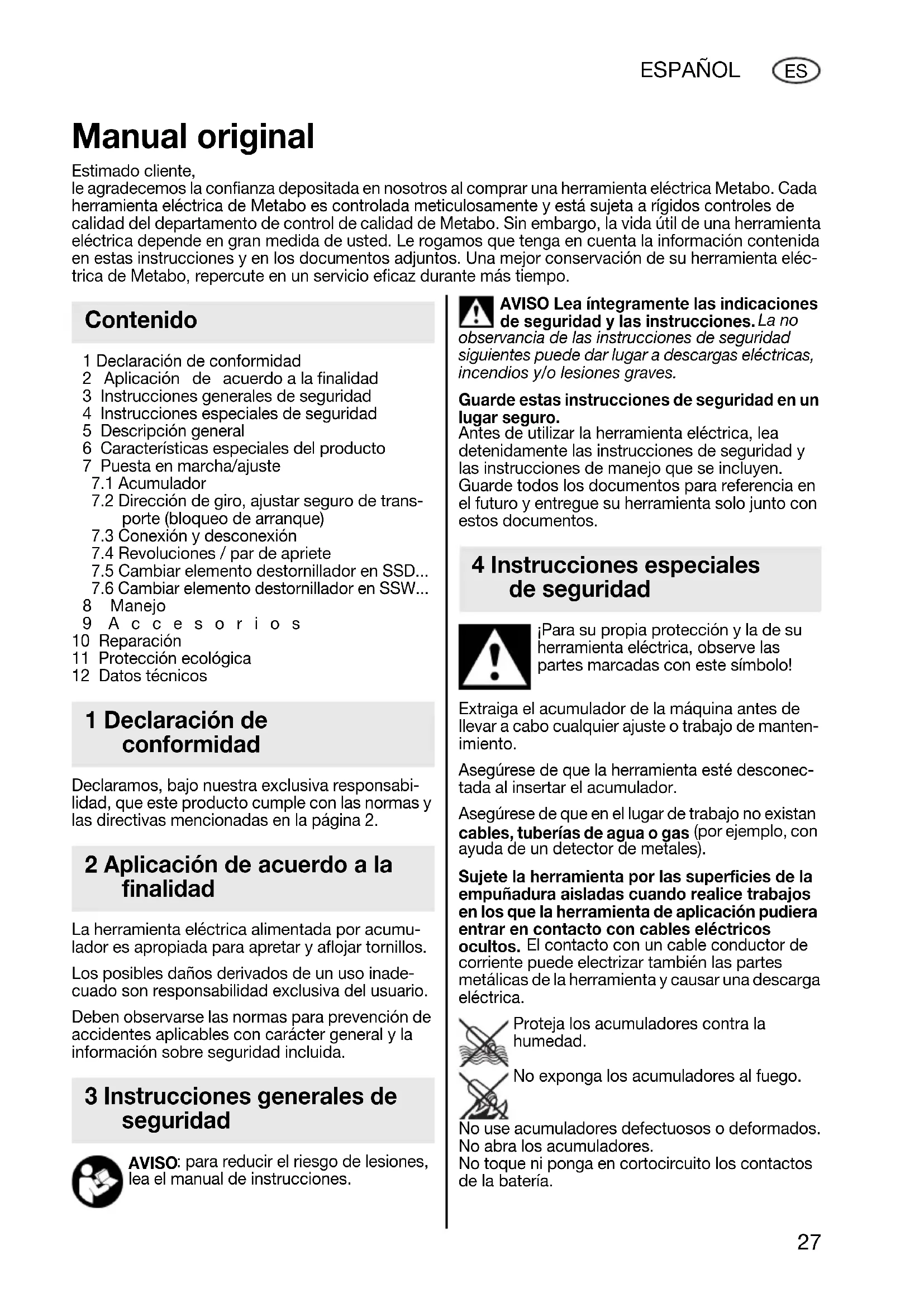1 Declaración de conformidad 2 Aplicación de acuerdo a la finalidad 3 Instrucciones generales de seguridad 4 Instrucciones especiales de seguridad 5 Descripción general 6 Características especiales del producto 7 Puesta en marcha/ajuste