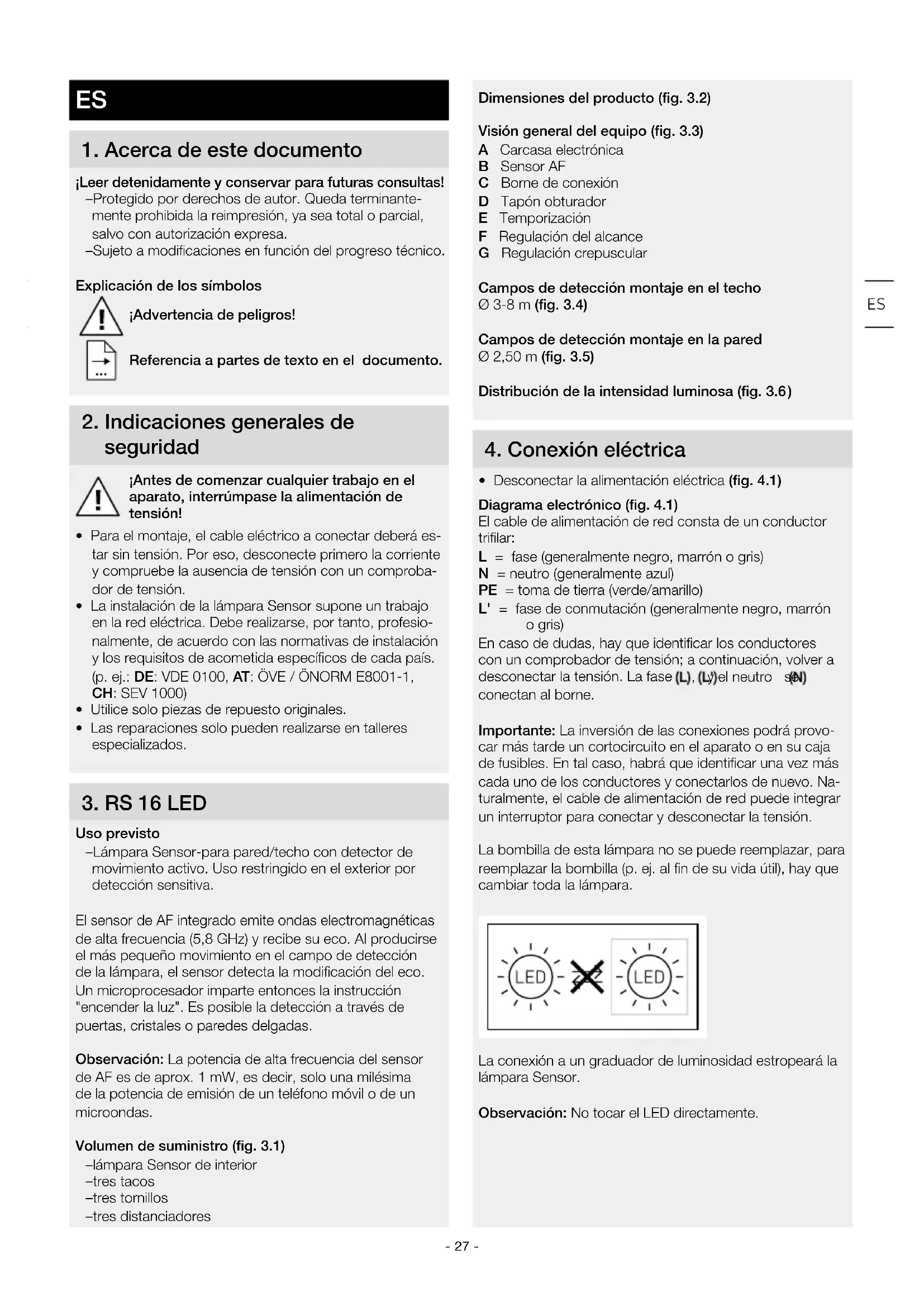Uso previsto – Lámpara Sensor-para pared/techo con detector de movimiento activo. Uso restringido en el exterior por detección sensitiva. El sensor de AF integrado emite ondas electromagnéticas de alta frecuencia (5,8 GHz) y recibe su eco. Al producirse el más pequeño movimiento en el campo de detección de la lámpara, el sensor detecta la modificación del eco. Un microprocesador imparte entonces la instrucción "encender la luz". Es posible la detección a través de puertas, cristales o paredes delgadas. Observación: La potencia de alta frecuencia del sensor de AF es de aprox. 1 mW, es decir, solo una milésima de la potencia de emisión de un teléfono móvil o de un microondas. Volumen de suministro (fig. 3.1) – lámpara Sensor de interior – tres tacos – tres tornillos – tres distanciadores ES- 28 -