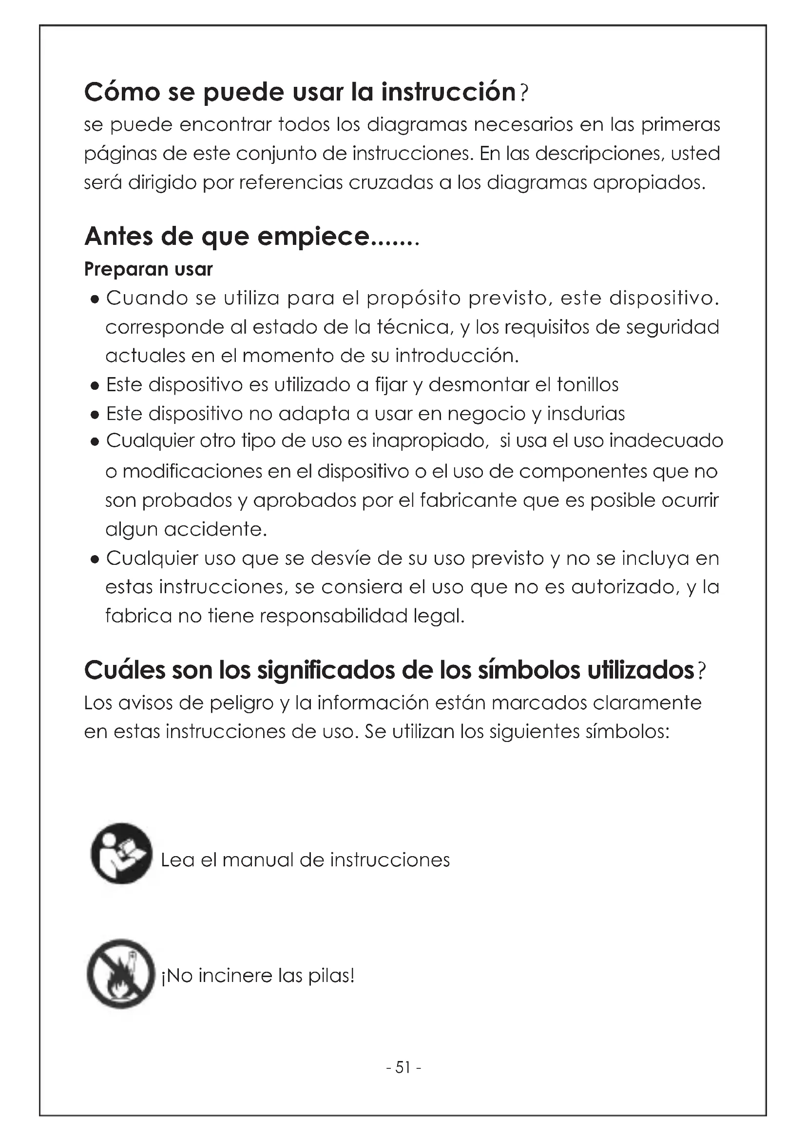 Lea el manual de instrucciones ¡No incinere las pilas! ¡Para el uso interior sólo! Construcción de la clase II Protección del Medio Ambiente Productos abandonados eléctricos no se deben desechar con los residuos domésticos. Por favor recicle donde existen instalaciones de reciclaje.Consulte a su autoridad local o minorista para asesoramiento de reciclaje de. Conforme a la legislación pertinente y las normas de seguridad. Baterías de Li-ion son reciclables y no se deben desechar con los residuos domésticos. Por favor recicle donde existen instalaciones de reciclaje. Consulte a su autoridad local o minorista para consejos de reciclajeCómo se puede usar la instrucción? se puede encontrar todos los diagramas necesarios en las primeras páginas de este conjunto de instrucciones. En las descripciones, usted será dirigido por referencias cruzadas a los diagramas apropiados. Antes de que empiece....... Preparan usar ● Cuando se utiliza para el propósito previsto, este dispositivo. corresponde al estado de la técnica, y los requisitos de seguridad actuales en el momento de su introducción. ● Este dispositivo es utilizado a fijar y desmontar el tonillos ● Este dispositivo no adapta a usar en negocio y insdurias ● Cualquier otro tipo de uso es inapropiado, si usa el uso inadecuado o modificaciones en el dispositivo o el uso de componentes que no son probados y aprobados por el fabricante que es posible ocurrir algun accidente. ● Cualquier uso que se desvíe de su uso previsto y no se incluya en estas instrucciones, se consiera el uso que no es autorizado, y la fabrica no tiene responsabilidad legal. Cuáles son los significados de los símbolos utilizados? Los avisos de peligro y la información están marcados claramente en estas instrucciones de uso. Se utilizan los siguientes símbolos: Situación peligrosa que puede conducir a lesiones. Noticia! Peligro de daños en el dispositivo! Situación que puede dar lugar a daños materiales. Nota: Información que le ayudará a comprender mejor los procesos involucrados. Para su seguridad Para su seguridad Unas introducciones de seguridad generalmente ● Para utilizar este dispositivo de forma segura, el usuario debe haber leído y comprendido estas instrucciones de uso antes de utilizar el dispositivo por primera vez. ● Si vende o pasa el dispositivo, también debe entregar estas instrucciones de funcionamiento. Información general de seguridad para herramientas eléctricas ADVERTENCIA! Lee todas las instrucciones. si no obedecestodas las instrucciones que se indicen a continuación puede provocar descargas eléctricas, incendio y / o lesiones graves. ● Guarde todas las instrucciones de seguridad e instrucciones de seguridad para consultarlas en futura.La herramienta eléctrica plazo en todas las siguientes instrucciones se refiere a su aparato eléctrico (cable) de la herramienta eléctrica o batería de herramientas (sin cable) de potencia. La seguridad en trabajo ● Mantenga el área de trabajo limpia y bien iluminada. Las áreas desordenadas y oscuras se puede producir los accidentes. ● No utilice herramientas eléctricas en atmósferas explosivas, por ejemplo en la situacion que existen los líquidos inflamables, gases o polvo. Las herramientas eléctricas crean chispas, que pueden encender el polvo o los vapores. ● Evite el contacto corporal con superficies conectadas a tierra, tales como tuberías, radiadores, estufas y refrigeradores. Existe un mayor riesgo de descarga eléctrica si su cuerpo está conectado a tierra o conectado a tierra. ● No exponga las herramientas eléctricas a la lluvia o la condiciones húmedas. El agua que entra en una herramienta eléctrica aumentará el riesgo de descarga eléctrica. ● No abuse del cable. Nunca use el cable para transportar, tirar o desenchufar la herramienta eléctrica. Mantenga el cable alejado del calor, aceite, bordes afilados o partes móviles. Los cables dañados o enredados aumentan el riesgo de descarga eléctrica. ● Cuando utilizas una herramienta eléctrica al aire libre, utilice un cable de extensión adecuado para uso en exteriores. El uso de un cable adecuado para uso en exteriores reduce el riesgo de descarga eléctrica. ● Si el uso de una herramienta eléctrica en una ubicación húmeda es inevitable,utilice un suministro protegido de dispositivo de corriente residual (RCD).El uso de un RCD reduce el riesgo de descarga eléctrica. Seguridad Personal ● Manténgase alerta, observe lo que está haciendo y use el sentido común al operar una herramienta eléctrica.No use una herramienta eléctrica mientras esté cansado o bajo la influencia de drogas, alcohol o medicamentos.Un momento de inatención al operar herramientas eléctricas puede resultar en lesiones personales graves. ● Use equipo de seguridad. Siempre use protección para los ojos. Equipos de seguridad como máscaras contra el polvo, zapatos de seguridad antideslizantes, sombrero duro o protección auditiva usados para condiciones apropiadas reducirán las lesiones personales. ● Evite el arranque accidental. Asegúrese de que el interruptor esté en la posición de apagado antes de enchufarlo. Llevar las herramientas eléctricas con el dedo en el interruptor o enchufar las herramientas eléctricas que tienen el interruptor encendido invita a accidentes. ● Quite cualquier llave de ajuste o llave antes de encender la herramienta eléctrica.Una llave o una llave izquierda unida a una parte giratoria de la herramienta eléctrica puede resultar en lesiones personales. ● No alcance demasiado. Mantenga la postura y el equilibrio en todo momento. Esto permite un mejor control de la herramienta eléctrica en situaciones inesperadas. ● Vístete apropiadamente. No use ropa suelta o joyas. Mantenga el cabello, la ropa y los guantes alejados de las partes móviles. La ropa floja, la joyería o el pelo largo pueden quedar atrapados en las partes móviles. ● Si se dispone de dispositivo