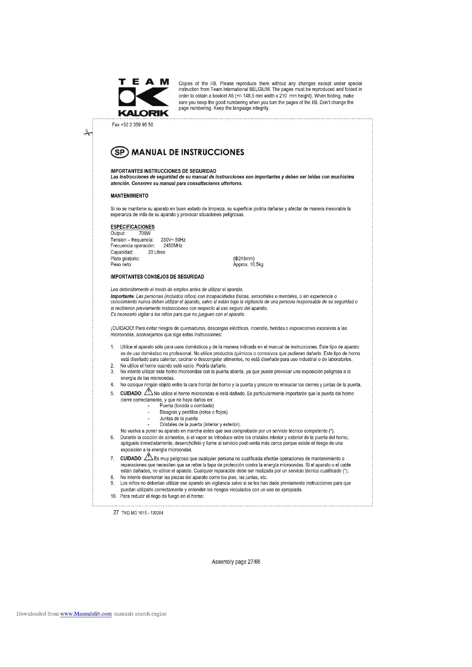 se vaya a cocinar. Downloaded from www.Manualslib.com manuals search engineCopies of the I/B. Please reproduce them without any changes except under special instruction from Team International BELGIUM. The pages must be reproduced and folded in order to obtain a booklet A5 (+/- 148.5 mm width x 210 mm height). When folding, make sure you keep the good numbering when you turn the pages of the I/B. Don’t change the page numbering. Keep the language integrity.