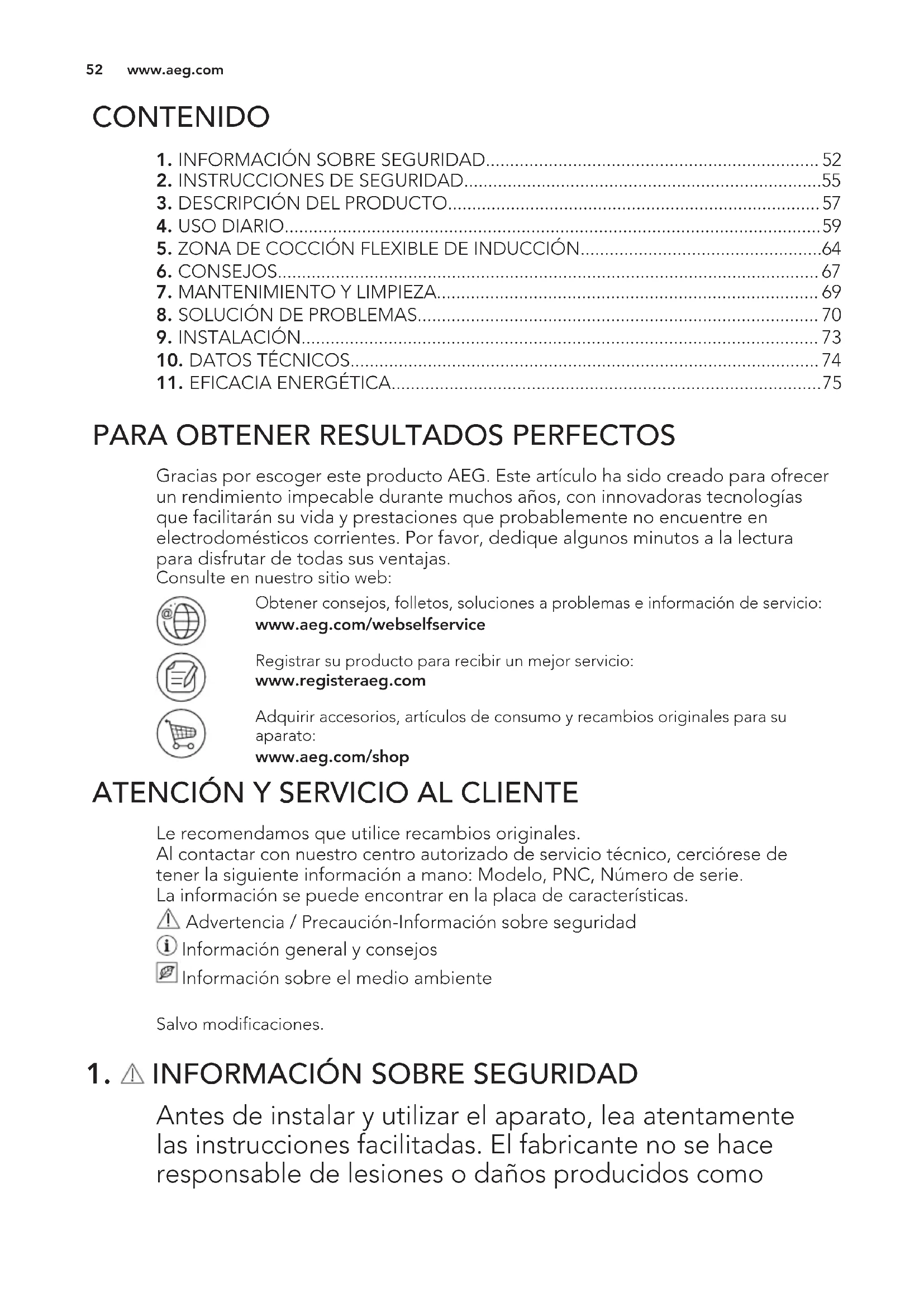Antes de instalar y utilizar el aparato, lea atentamente las instrucciones facilitadas. El fabricante no se hace responsable de lesiones o daños producidos como www.aeg.com 52resultado de una instalación o un uso incorrectos: Conserve siempre estas instrucciones en lugar seguro y accesible para futuras consultas.