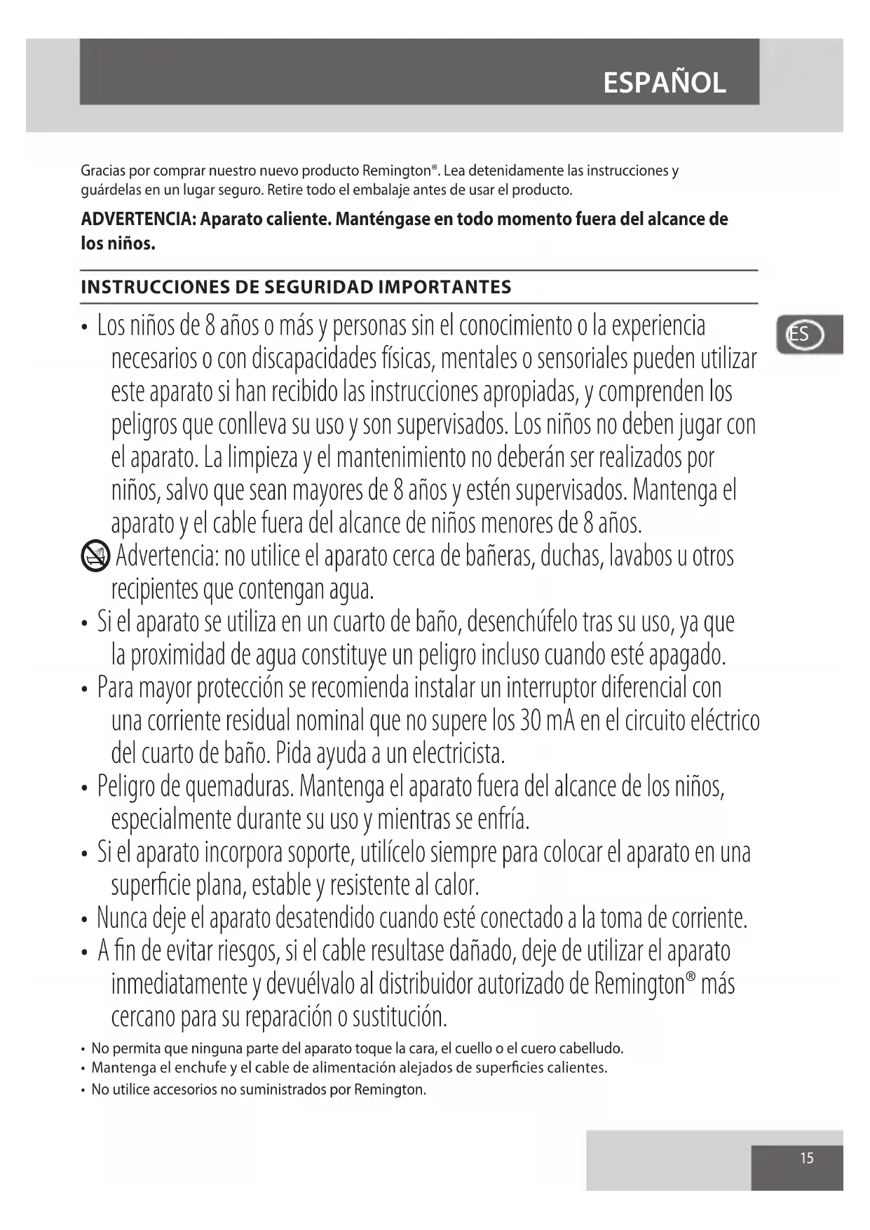 - No utilice accesorios no suministrados por Remington. ESPAÑOL