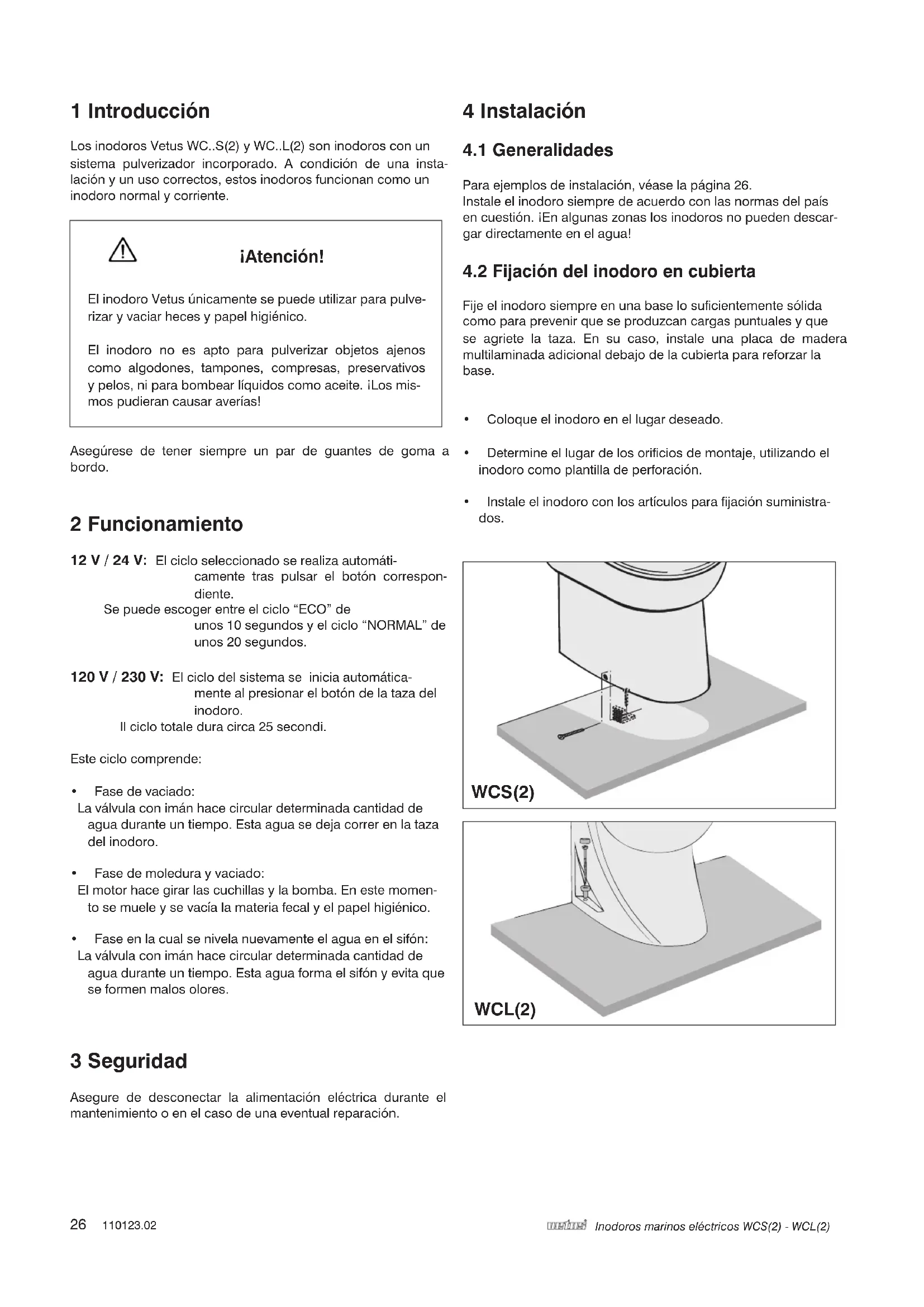 - Veilleràcequelapressionatteigneau moins 1,5 bar. 12 V / 24 V120 V / 230 V 12 V / 24 V 120 V / 230 V FRANÇAIS26 110123.02 Inodoros marinos eléctricos WCS(2) - WCL(2) 1 Introducción Los inodoros Vetus WC..S(2) y WC..L(2) son inodoros con un sistema pulverizador incorporado. A condición de una insta- lación y un uso correctos, estos inodoros funcionan como un inodoro normal y corriente.
