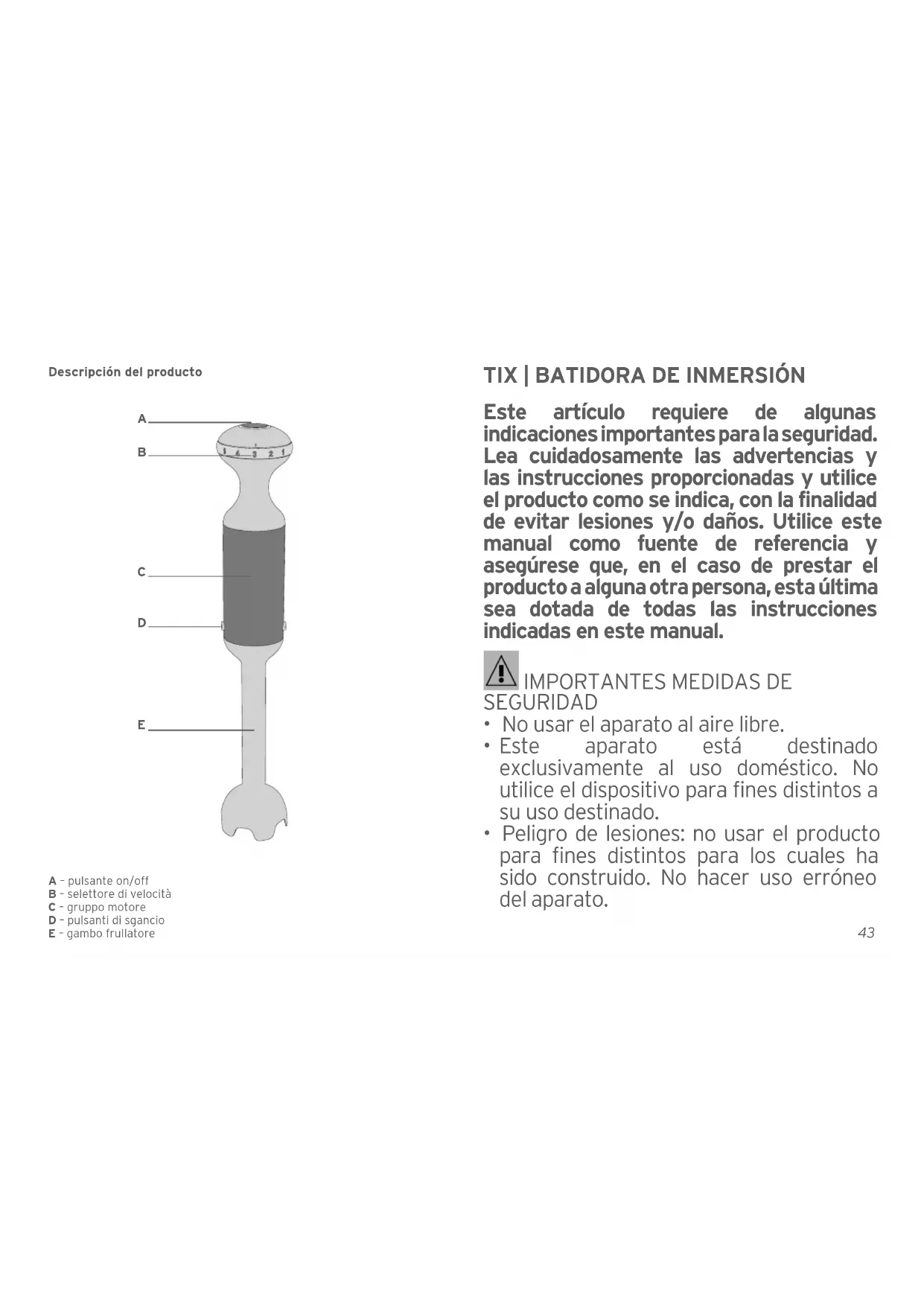 Este articulo requires de lasunas indicaciones importantes para la seguridad. Lea cuidadosamente las advertencias y las instructuciones proportionsadas y utilise el producto como se indica, con la finalidad de evacar lesiones y/o daños. Utilice este manual como fuente de referencia y asegúrese que, en el caso de prestar el producto a una othera persona, estaULTa sea dotada de todas las instructaciones indicadas en este manual.