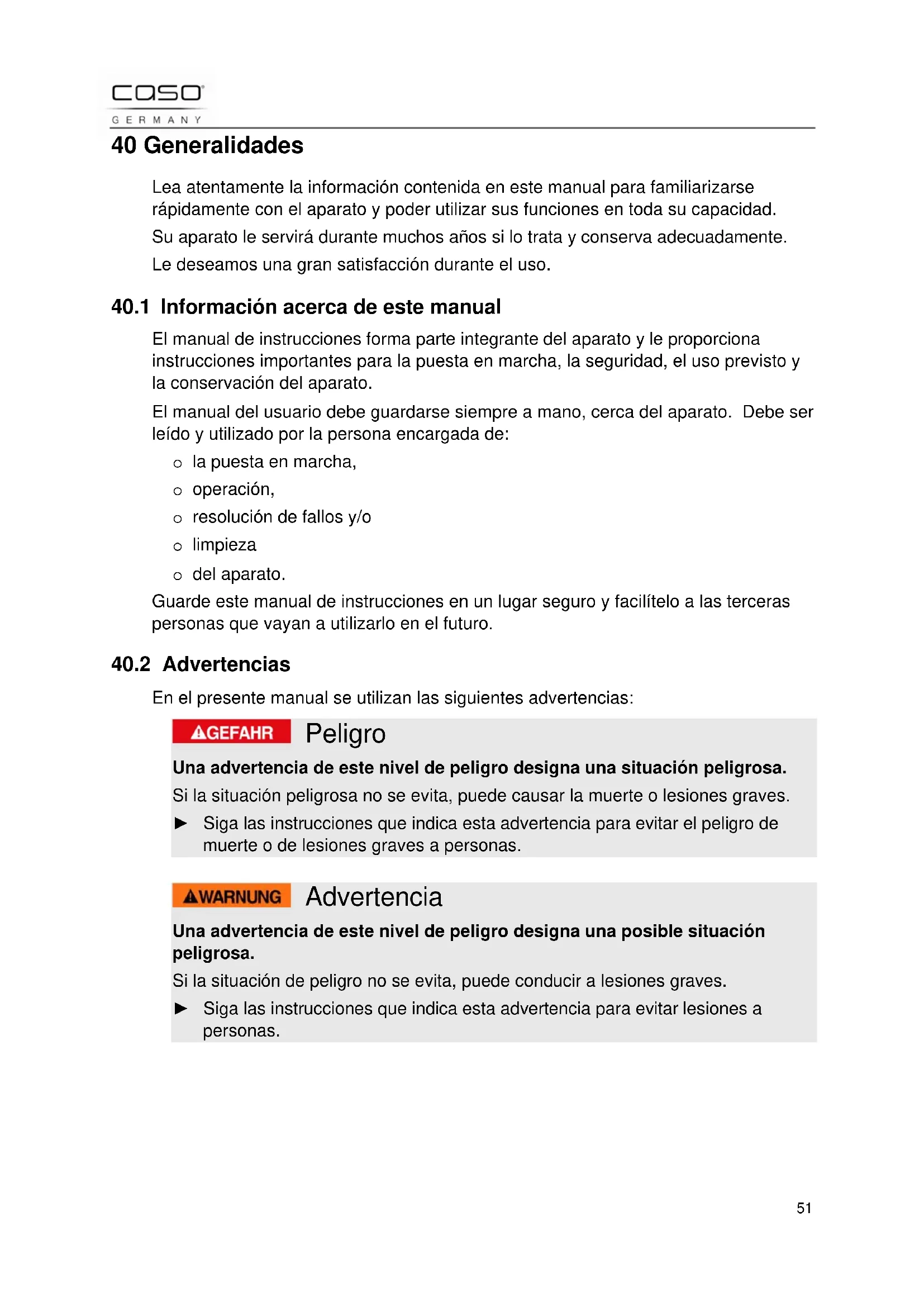 El manual de instrucciones forma parte integrante del aparato y le proporciona instrucciones importantes para la puesta en marcha, la seguridad, el uso previsto y la conservación del aparato. El manual del usuario debe guardarse siempre a mano, cerca del aparato. Debe ser leído y utilizado por la persona encargada de: o la puesta en marcha, o operación, o resolución de fallos y/o o limpieza o del aparato. Guarde este manual de instrucciones en un lugar seguro y facilítelo a las terceras personas que vayan a utilizarlo en el futuro.