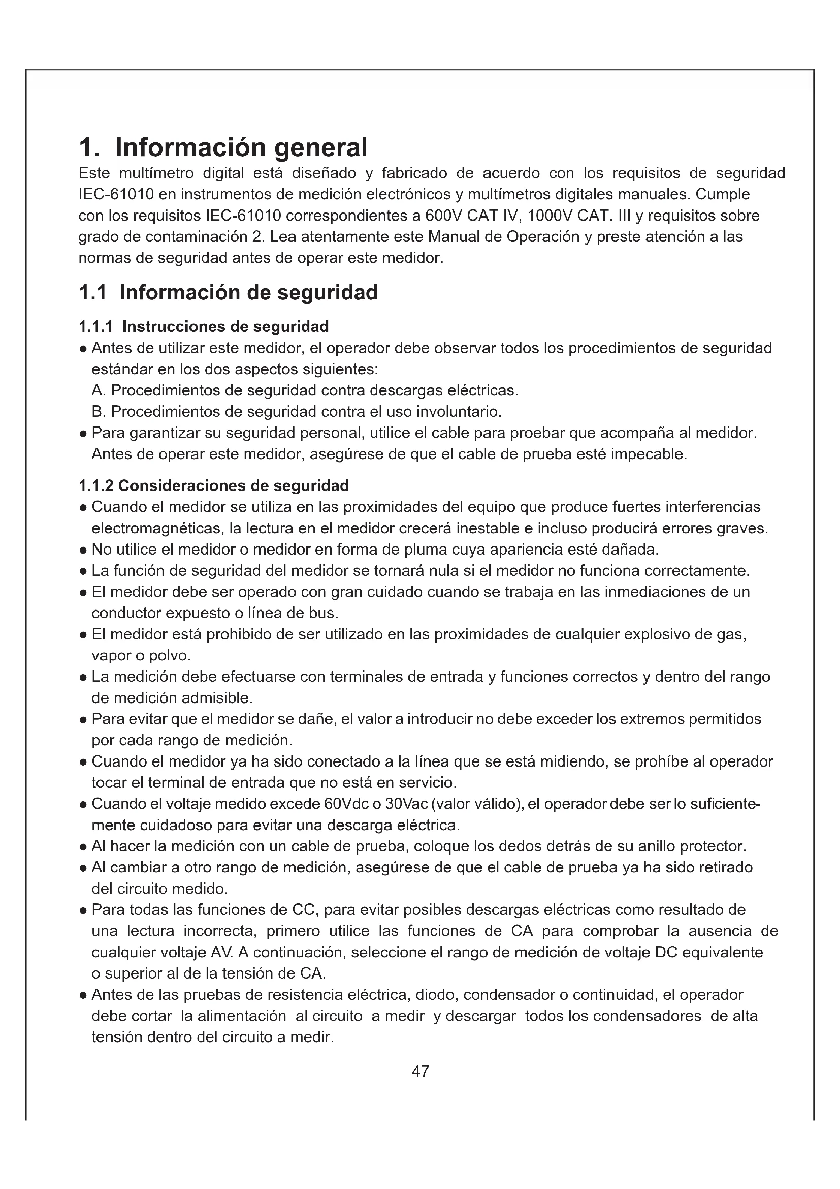 Este multímetro digital está diseñado y fabricado de acuerdo con los requisitos de seguridad IEC-61010 en instrumentos de medición electrónicos y multímetros digitales manuales. Cumple con los requisitos IEC-61010 correspondientes a 600V CAT IV, 1000V CAT. III y requisitos sobre grado de contaminación 2. Lea atentamente este Manual de Operación y preste atención a las normas de seguridad antes de operar este medidor.