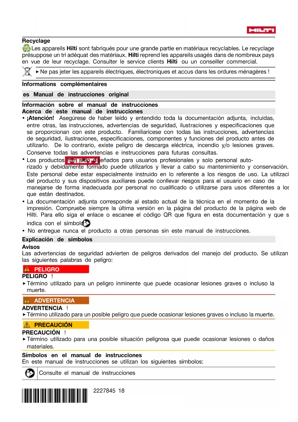 - La documentación adjunta corresponde al estado actual de la técnica en el momento de la impresión. Compruebe siempre la última versión en la página del producto de la página web de Hilti. Para ello siga el enlace o escanee el código QR que figura en esta documentación y que se indica con el símbolo .