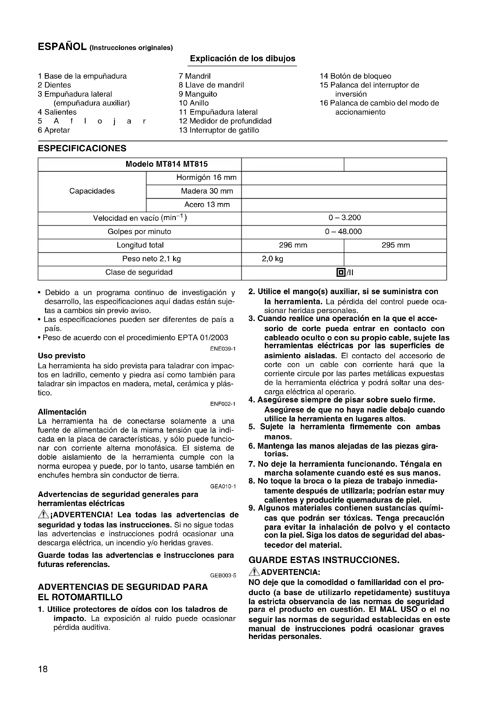 Descarga las instrucciones para tu Perforar en formato PDF gratis! Encuentra tus instrucciones MT815 - Maktec y toma tu dispositivo electrónico nuevamente en la mano. En esta página están publicados todos los documentos necesarios para el uso de su dispositivo. MT815 de la marca Maktec.