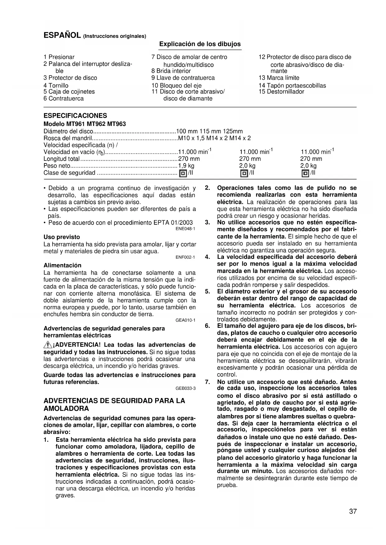 MT961 - Amoladora angular Maktec - Manual de uso y guía de instrucciones gratis