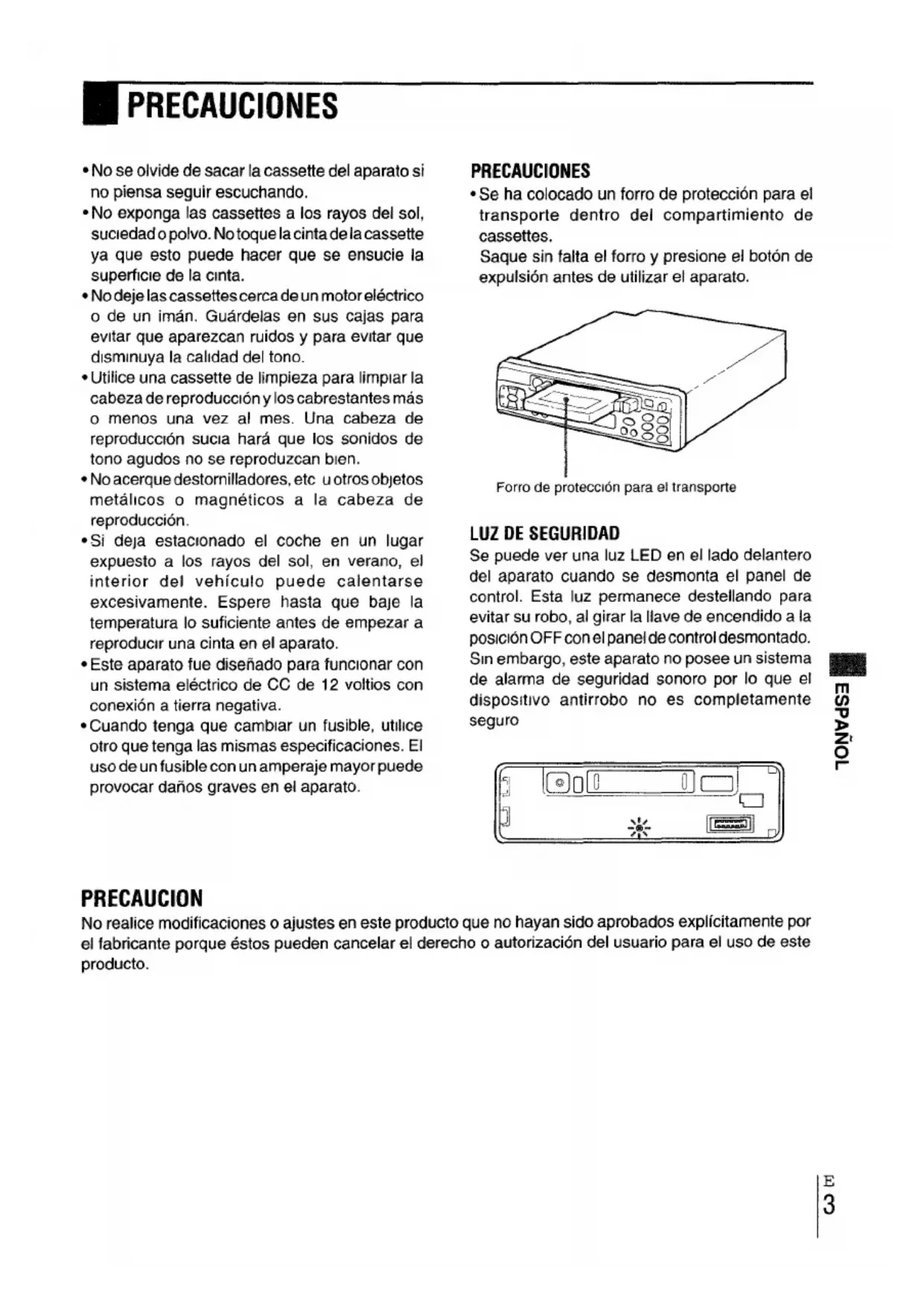 CONEXION DE UN TOCADISCOS DE DISCOS COMPACTOS PORTATIL U OTRO EQUIPO ....15 ESPECIFICACIONES .. . ... ... ........ .. .. .... .. 16 ;PRECAUCIONES ● No se olvide de sacar la cassette del aparato si no piensa seguir escuchando. *No exponga Ias cassettes a Ios rayos del sol, sucledad o polvo. Notoque la cinta de la cassette ya que esto puede hater que se ensucie la superhcie de la ctnta. ● No deje Ias cassettes cerca de un motor electrico o de un iman. Guardelas en sus cajas para ewtar que aparezcan ruidos y para evltar que dlsmmuya la cahdad del tono. ● Utilice una cassette de Iimpieza para Iimplar la cabeza de reproducc}on y Ios cabrestantes mas o menos una vez al roes. Una cabeza de reproduction sucla harA que Ios sonidos de tono agudos no se reproduzcan blen. ● No acerque destornilladores, etc u otros ob)etos metalicos o magneticos a la cabeza de reproduction, ..Si deja estaclonado el coche en Un Iugar expuesto a Ios rayos del sol, en verano, el interior del veh(culo puede calentarse excesivamente. Espere hasta que baje la temperature 10suficiente antes de empezar a reproducer una cinta en el aparato. ● Este aparato fue disefiado para funclonar con un sistema electrico de CC de 12 voltios con conexion a tierra negativa. ● Cuando tenga que camblar un fusible, uthce otro que tenga Ias mismas especificaciones. El uso de un fusible con un amperaje mayor puede provocar dahos graves en el aparato. PRECAUCIONES ● Se ha colocado un forro de protection para el transport dentro del compartimiento de cassettes. Saque sin falta el forro y presione el boton de expulsion antes de utilizar et aparato. Forro de p;oteccion para el transport LUZ DESEGURIDAD Se puede ver una Iuz LED en el Iado delantero del aparato cuando se desmonta el panel de control. Esta Iuz permanece destellando para evitar su robo, al girar la Ilave de encendido a la posiclon OFF con el panel decontrol desmontado. Sm embargo, este aparato no posee un sistema de alarma de seguridad sonoro por 10 que et