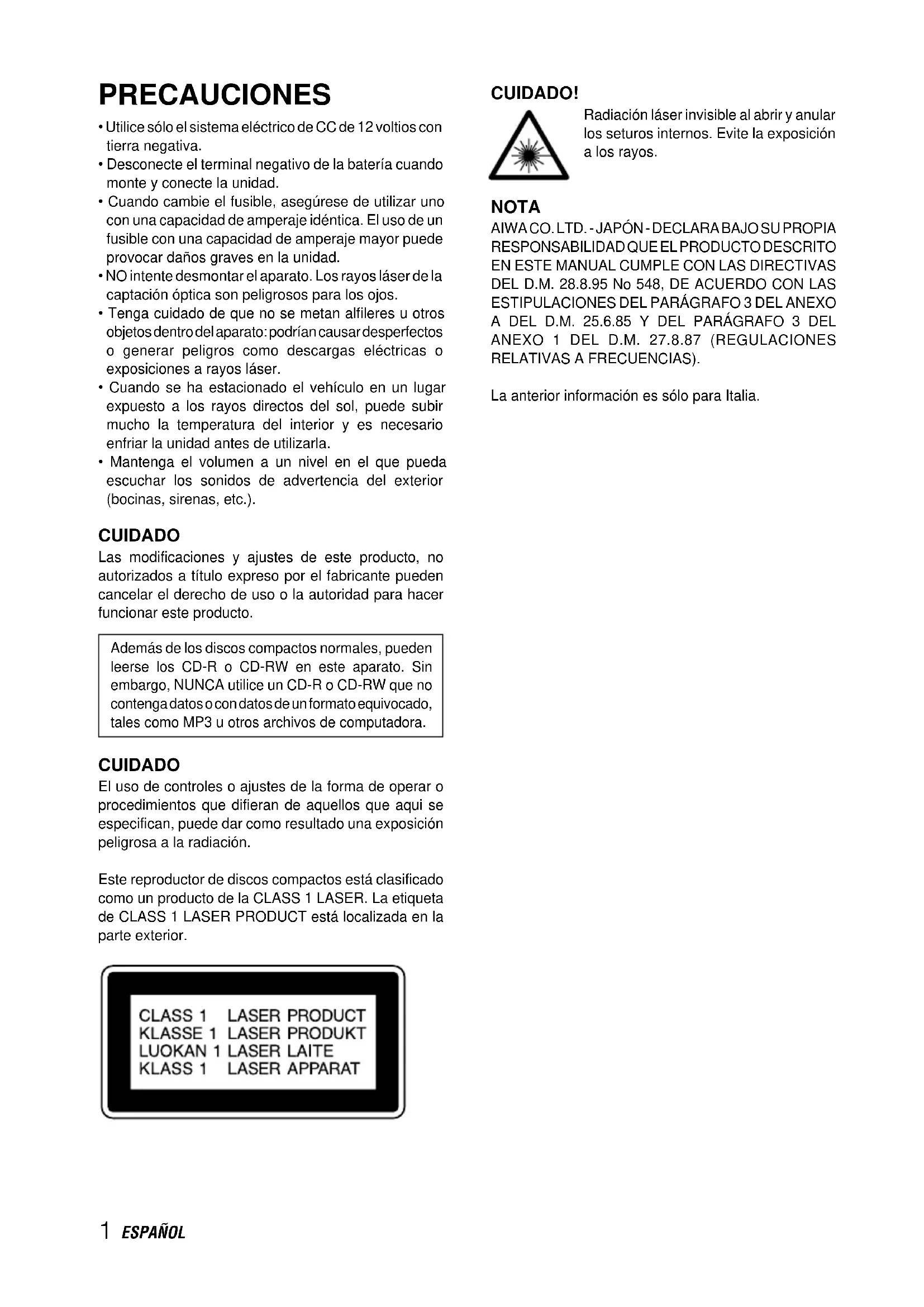 ESPAÑOL CUIDADO! Radiación láser invisible al abrir y anular los seturos internos. Evite la exposición a los rayos. NOTA AIWA CO. LTD. - JAPÓN - DECLARA BAJO SU PROPIA