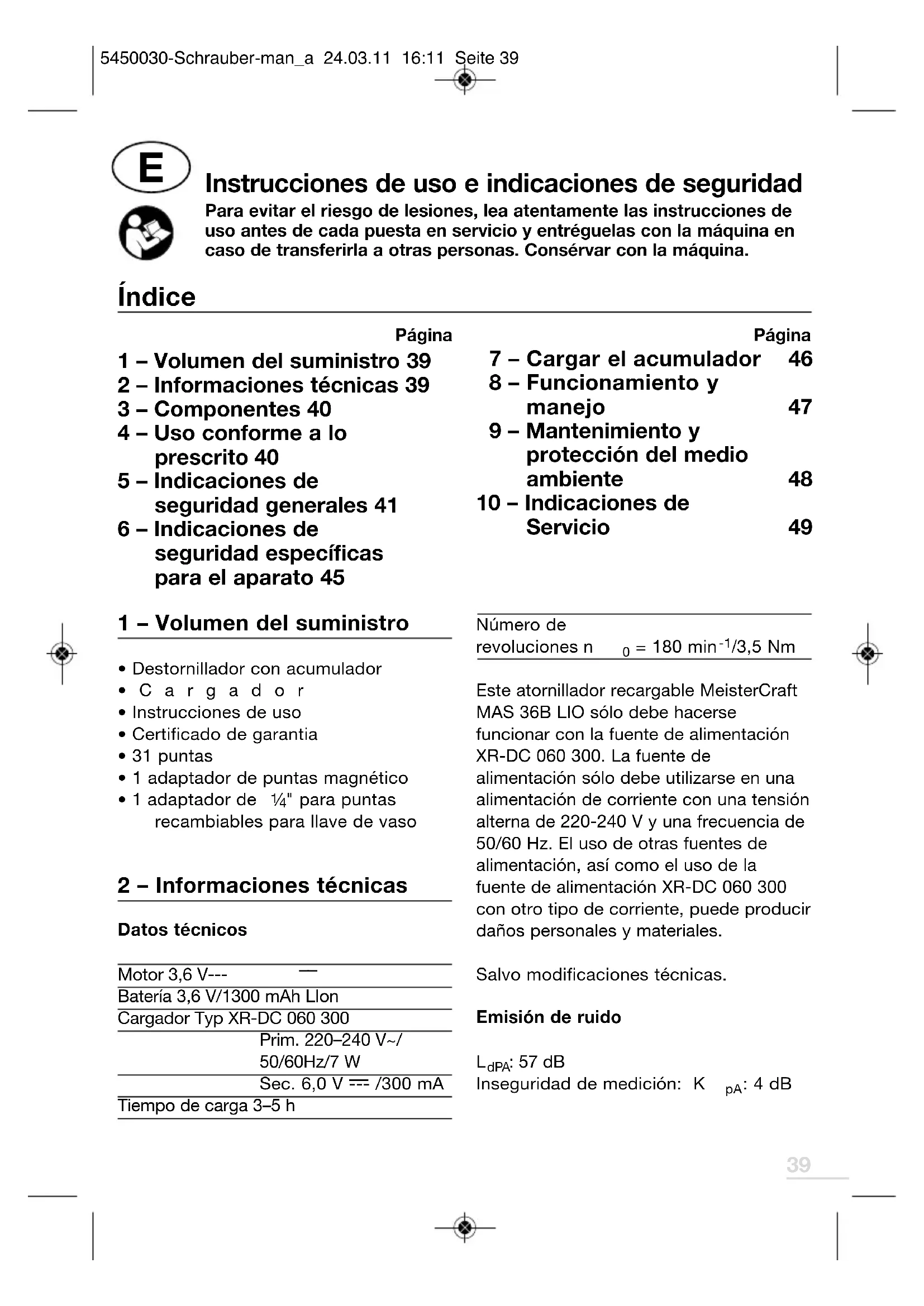 MeisterCraft MAS 36B LIO solo debehacerse funcionar con la fuente de alimentacion XR-DC 060 300. La fuente de alimentacion solo debeutilizarse en una alimentacion decorrente con una tension alterna de220-240 V y una Frequencia de50/60 Hz.El uso de otheras fuentes de alimentacion, asi como el uso de la fuente de alimentacion XR-DC 060 300 con othero tipo de corrente, puede producir daños personales y materiales.