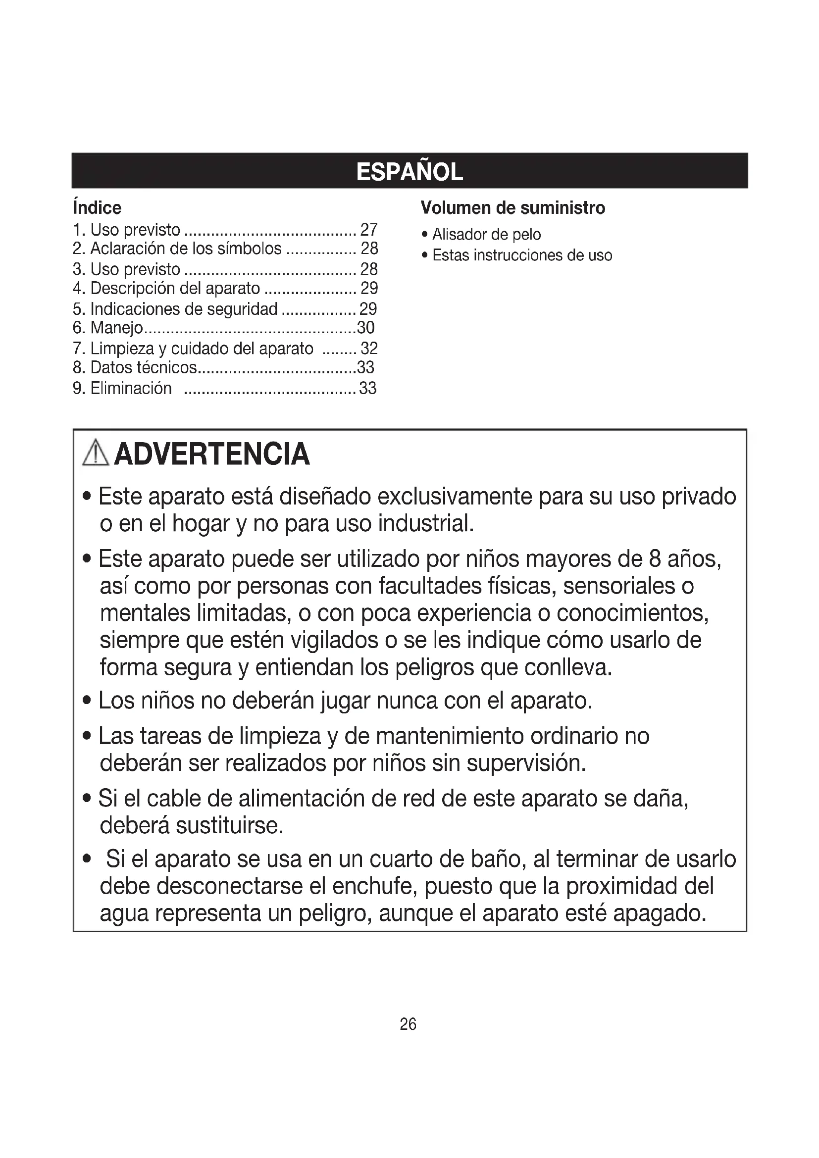 Si el aparato se usa en un cuarto de baño, al terminar de usarlo debe desconectarse el enchufe, puesto que la proximidad del agua representa un peligro, aunque el aparato esté apagado.27