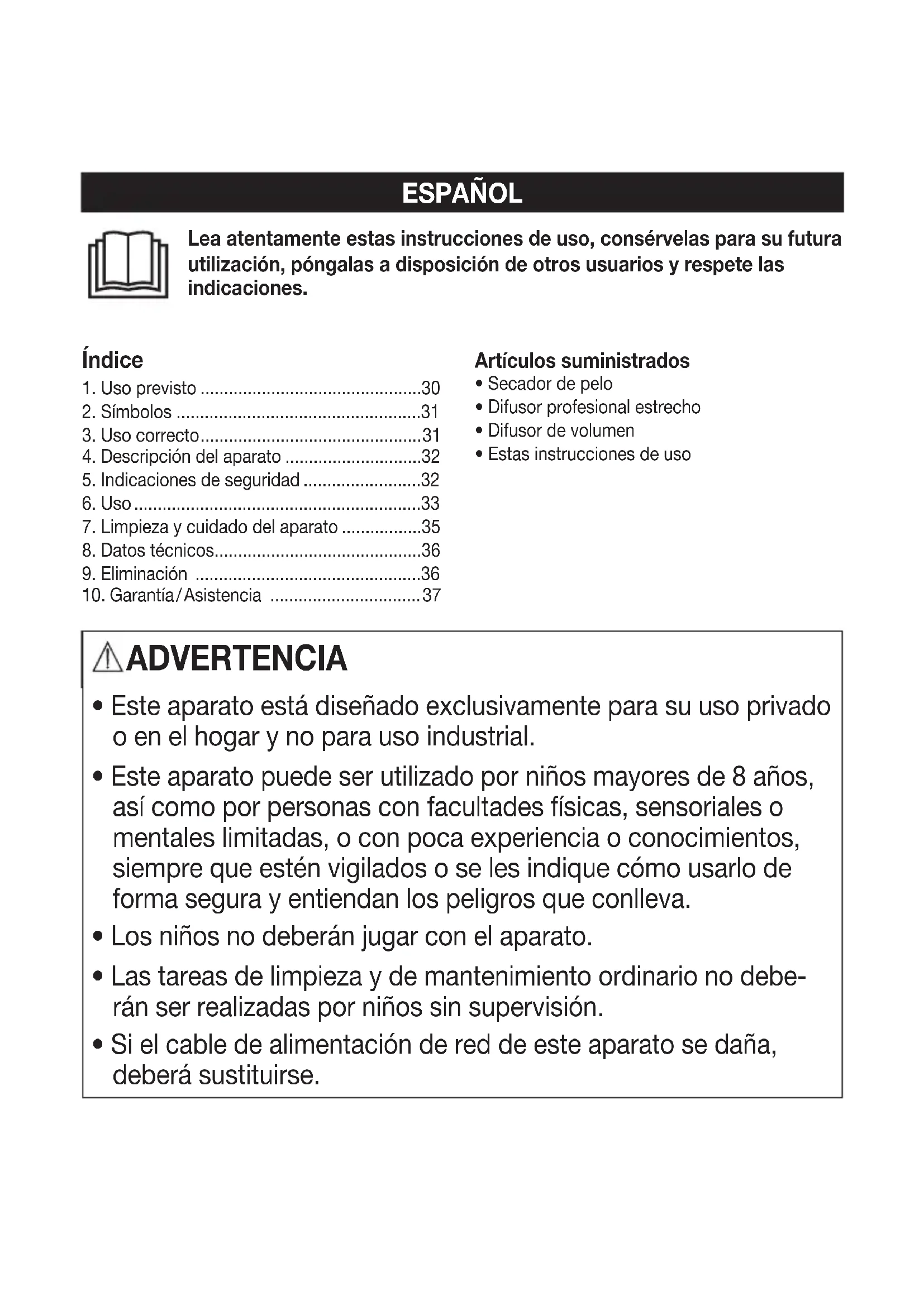 El secador de pelo está previsto para el secado y modelado profesional del cabello. El secador puede ajustarse a las necesidades de cada persona gracias a sus dos niveles de veloci- dad y sus tres niveles de calor. La función de aire frío adicional permite fijar mejor el peinado. El difusor profesional estrecho permite modelar a voluntad el cabello y el accesorio difusor confiere a su cabello un volumen adicional. La tecnología de iones integrada neutraliza el cabello mediante iones con carga negativa. Se evita la carga estática del cabello. El mecanismo de desconexión automático protege el aparato contra sobrecalentamiento. Los filtros extraíbles facilitan la eliminación de pelusa, polvo y pelos aspirados. El aparato cuenta con un sistema de enrollamiento automático del cable, mediante el que cable se enrolla cómodamente en el secador de pelo. Este aparato solo está previsto para el fin descrito en estas instrucciones de uso. El fabricante no se responsabiliza de los daños derivados de un uso indebido o irresponsable.30 31