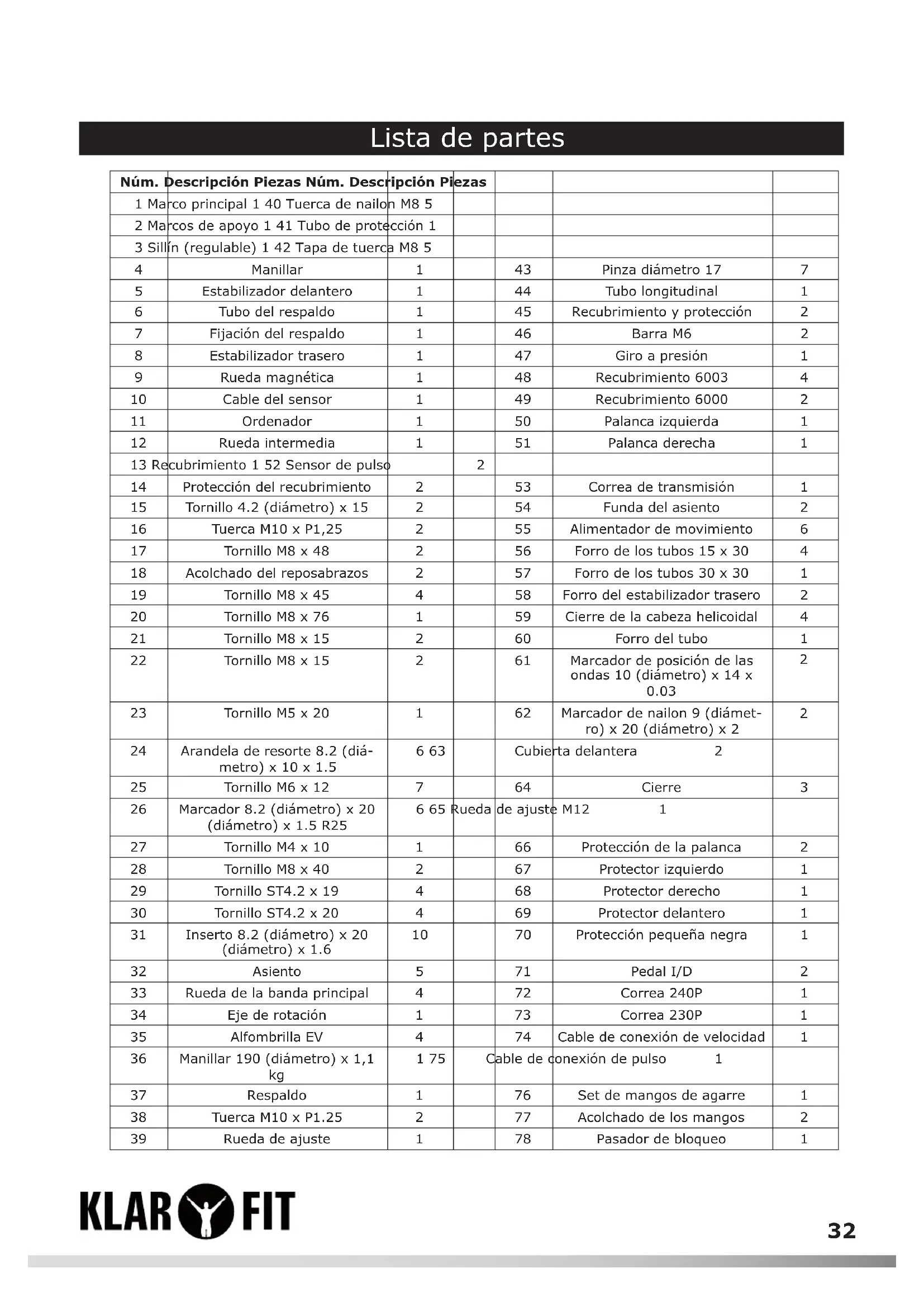 - Todas las partes moviles (por ej. pedales, manillar, sillin...) requiren mantenimiento semanal. Compruebalos antes de cada uso. Si hay una pieza sueña o rota, fjela inmediamente. Puede volver a usar el aparato en cuando haya reparado los daños.