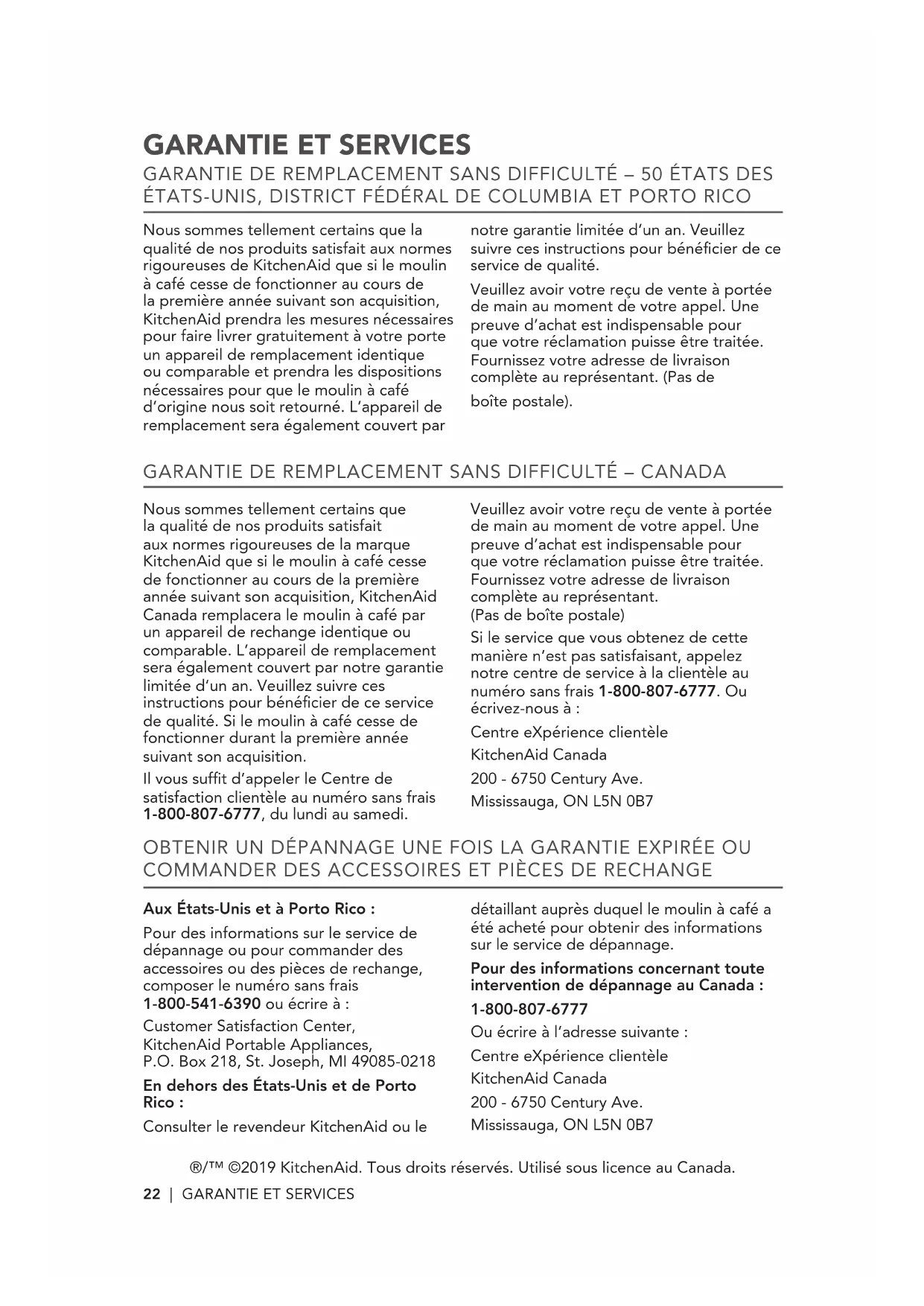 Confíamos tanto en que la calidad de nuestros productos cumple con las exigentes normas de KitchenAid que, si el molinillo de café presenta una bella falla durante el primer año de compra, KitchenAid Canada reemplazará su molinillo de café con una identica o un reemplazo comparable. Launidad de reemplazo está también cubierta por nuestra garantía limitada de un año. Sírvaseooteras instrucciones para recibir este servicios de calidad.