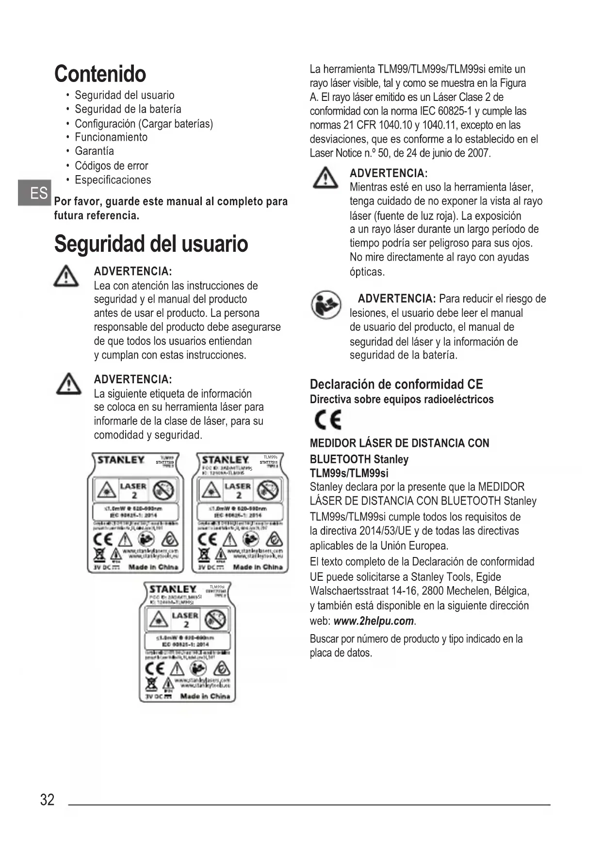 TLM99si La herramienta TLM99/TLM99s/TLM99si emite un rayo láser visible, tal y como se muestra en la Figura A. El rayo láser emitido es un Láser Clase 2 de conformidad con la norma IEC 60825-1 y cumple las normas 21 CFR 1040.10 y 1040.11, excepto en las desviaciones, que es conforme a lo establecido en el Laser Notice n.º 50, de 24 de junio de 2007.ADVERTENCIA:Mientras esté en uso la herramienta láser, tenga cuidado de no exponer la vista al rayo láser (fuente de luz roja). La exposición a un rayo láser durante un largo período de tiempo podría ser peligroso para sus ojos. No mire directamente al rayo con ayudas ópticas. ADVERTENCIA: Para reducir el riesgo de lesiones, el usuario debe leer el manual de usuario del producto, el manual de seguridad del láser y la información de seguridad de la batería. Declaración de conformidad CE Directiva sobre equipos radioeléctricosMEDIDOR LÁSER DE DISTANCIA CON BLUETOOTH StanleyTLM99s/TLM99siStanley declara por la presente que la MEDIDOR LÁSER DE DISTANCIA CON BLUETOOTH Stanley TLM99s/TLM99si cumple todos los requisitos de la directiva 2014/53/UE y de todas las directivas aplicables de la Unión Europea.El texto completo de la Declaración de conformidad UE puede solicitarse a Stanley Tools, Egide Walschaertsstraat 14-16, 2800 Mechelen, Bélgica, y también está disponible en la siguiente dirección web: www.2helpu.com.Buscar por número de producto y tipo indicado en la placa de datos
