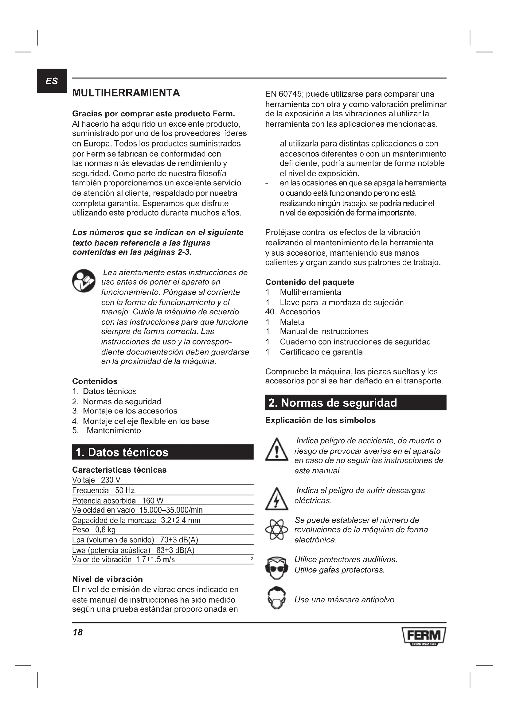 MULTIHERRAMIENTA Gracias por comprar este producto Ferm. Al hacerlo ha adquirido un excelente producto, suministrado por uno de los proveedores líderes en Europa. Todos los productos suministrados por Ferm se fabrican de conformidad con las normas más elevadas de rendimiento y seguridad. Como parte de nuestra filosofía también proporcionamos un excelente servicio de atención al cliente, respaldado por nuestra completa garantía. Esperamos que disfrute utilizando este producto durante muchos años. Los números que se indican en el siguiente texto hacen referencia a las figuras contenidas en las páginas 2-3. Lea atentamente estas instrucciones de uso antes de poner el aparato en funcionamiento. Póngase al corriente con la forma de funcionamiento y el manejo. Cuide la máquina de acuerdo con las instrucciones para que funcione siempre de forma correcta. Las instrucciones de uso y la correspon- diente documentación deben guardarse en la proximidad de la máquina. Contenidos