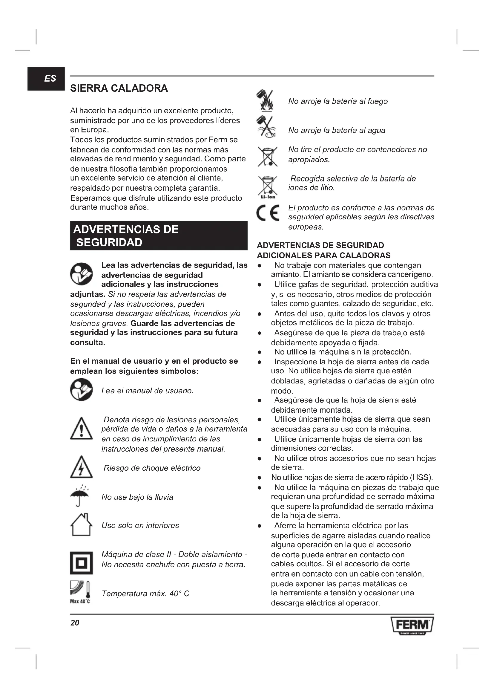 SIERRA CALADORA Al hacerlo ha adquirido un excelente producto, suministrado por uno de los proveedores líderes en Europa. Todos los productos suministrados por Ferm se fabrican de conformidad con las normas más elevadas de rendimiento y seguridad. Como parte de nuestra filosofía también proporcionamos un excelente servicio de atención al cliente, respaldado por nuestra completa garantía. Esperamosquedisfruteutilizandoesteproducto durante muchos años. ADVERTENCIAS DE SEGURIDAD Lea las advertencias de seguridad, las advertencias de seguridad adicionales y las instrucciones adjuntas. Si no respeta las advertencias de seguridad y las instrucciones, pueden ocasionarse descargas eléctricas, incendios y/o lesiones graves. Guarde las advertencias de seguridad y las instrucciones para su futura consulta. En el manual de usuario y en el producto se emplean los siguientes símbolos: Lea el manual de usuario. Denota riesgo de lesiones personales, pérdida de vida o daños a la herramienta en caso de incumplimiento de las instrucciones del presente manual. Riesgo de choque eléctrico No use bajo la lluvia Use solo en interiores Máquina de clase II - Doble aislamiento - No necesita enchufe con puesta a tierra. Temperatura máx. 40° C No arroje la batería al fuego No arroje la batería al agua No tire el producto en contenedores no apropiados. Recogida selectiva de la batería de iones de litio. El producto es conforme a las normas de seguridad aplicables según las directivas europeas.