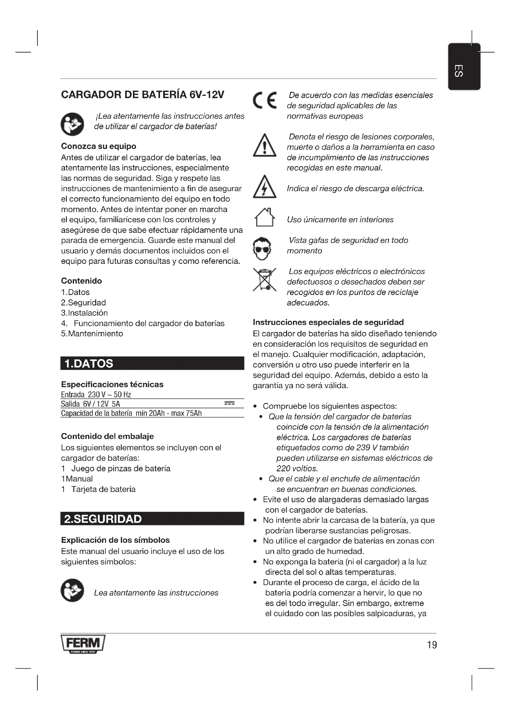 ¡Lea atentamente las instrucciones antes de utilizar el cargador de baterías! Conozca su equipo Antes de utilizar el cargador de baterías, lea atentamente las instrucciones, especialmente las normas de seguridad. Siga y respete las instrucciones de mantenimiento a fin de asegurar el correcto funcionamiento del equipo en todo momento. Antes de intentar poner en marcha el equipo, familiarícese con los controles y asegúrese de que sabe efectuar rápidamente una parada de emergencia. Guarde este manual del usuario y demás documentos incluidos con el equipo para futuras consultas y como referencia. Contenido