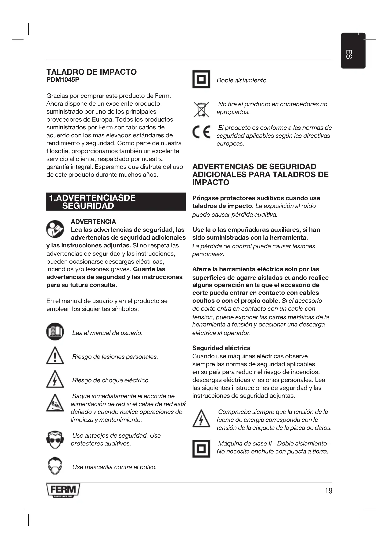 PDM1045P Gracias por comprar este producto de Ferm. Ahora dispone de un excelente producto, suministrado por uno de los principales proveedores de Europa. Todos los productos suministrados por Ferm son fabricados de acuerdo con los más elevados estándares de rendimiento y seguridad. Como parte de nuestra filosofía, proporcionamos también un excelente servicio al cliente, respaldado por nuestra garantía integral. Esperamos que disfrute del uso de este producto durante muchos años.