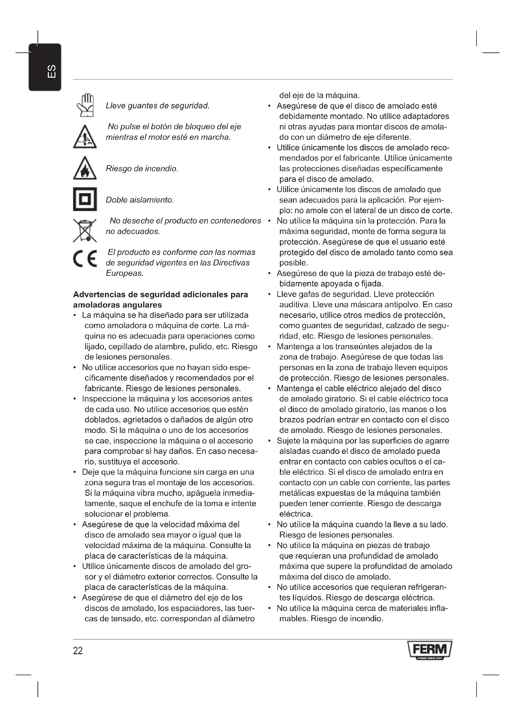 Lleve guantes de seguridad. No pulse el botón de bloqueo del eje mientras el motor esté en marcha. Riesgo de incendio. Doble aislamiento. No deseche el producto en contenedores no adecuados. El producto es conforme con las normas de seguridad vigentes en las Directivas Europeas. Advertencias de seguridad adicionales para amoladoras angulares