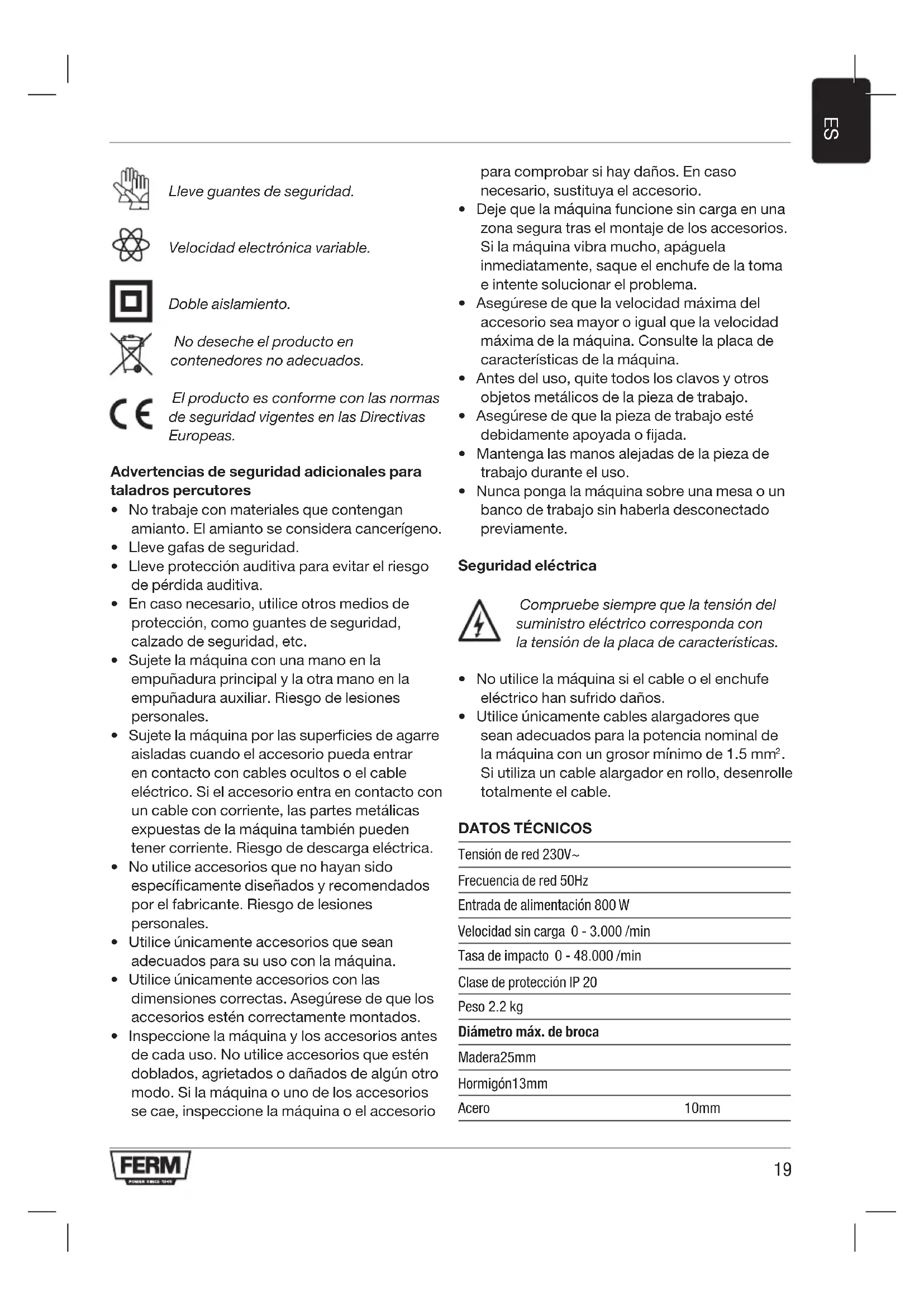 Lleve guantes de seguridad. Velocidad electrónica variable. Doble aislamiento. No deseche el producto en contenedores no adecuados. El producto es conforme con las normas de seguridad vigentes en las Directivas Europeas. Advertencias de seguridad adicionales para taladros percutores