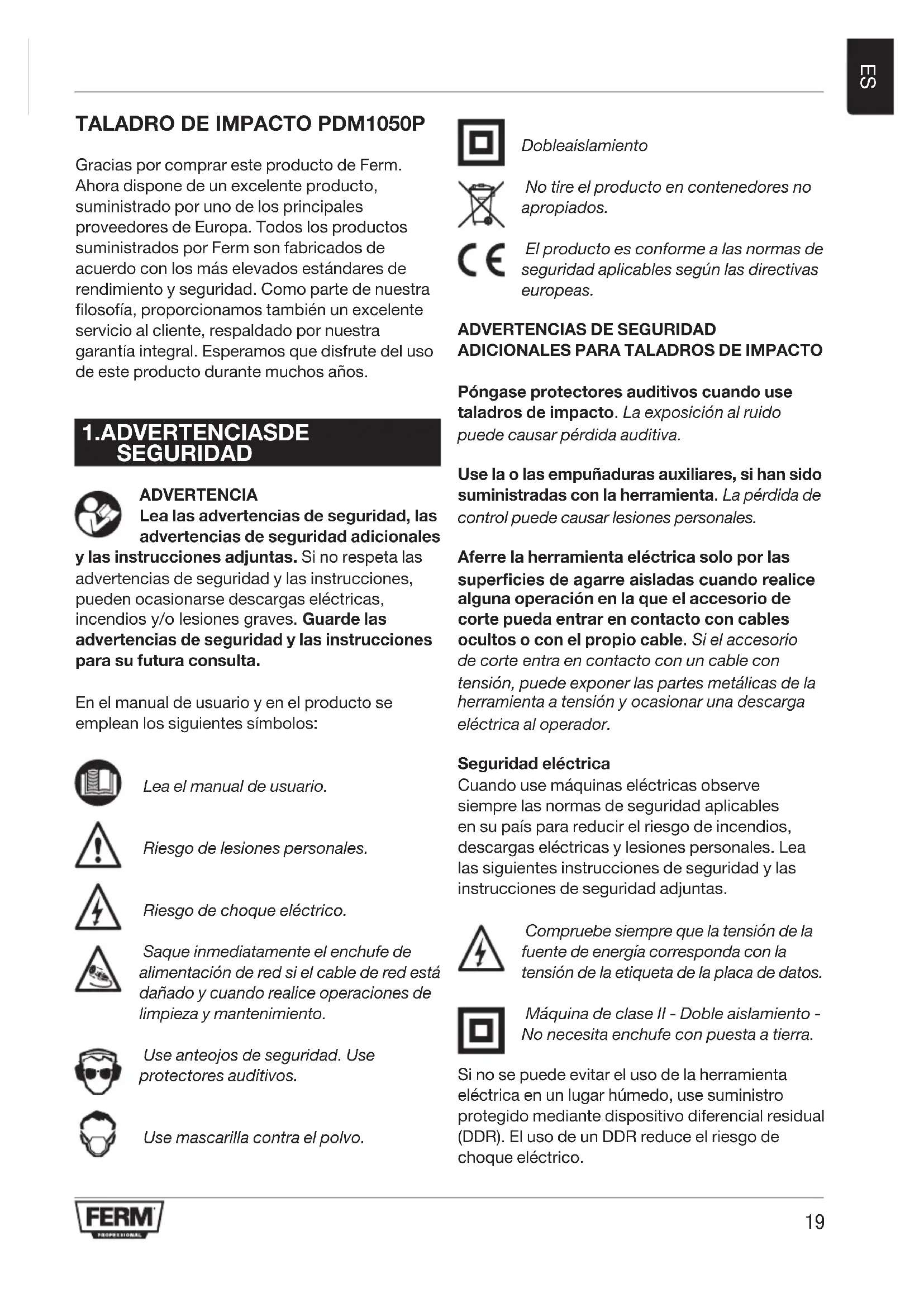 Descarga las instrucciones para tu Taladro electrico en formato PDF gratis! Encuentra tus instrucciones PDM1050P - Ferm y toma tu dispositivo electrónico nuevamente en la mano. En esta página están publicados todos los documentos necesarios para el uso de su dispositivo. PDM1050P de la marca Ferm.