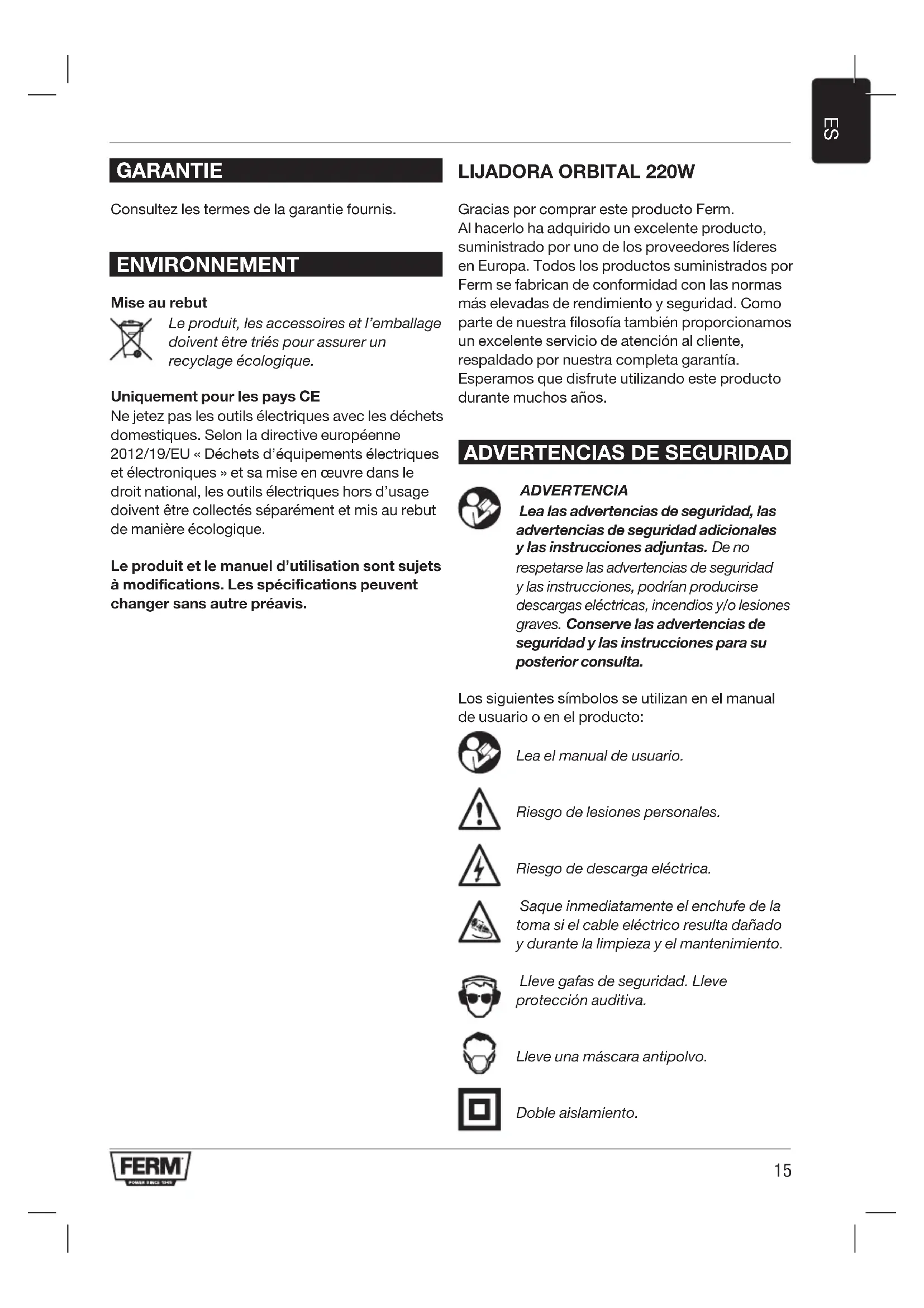 Gracias por comprar este producto Ferm. Al hacerlo ha adquirido un excelente producto, suministrado por uno de los proveedores líderes en Europa. Todos los productos suministrados por Ferm se fabrican de conformidad con las normas más elevadas de rendimiento y seguridad. Como parte de nuestra filosofía también proporcionamos un excelente servicio de atención al cliente, respaldado por nuestra completa garantía. Esperamos que disfrute utilizando este producto durante muchos años.