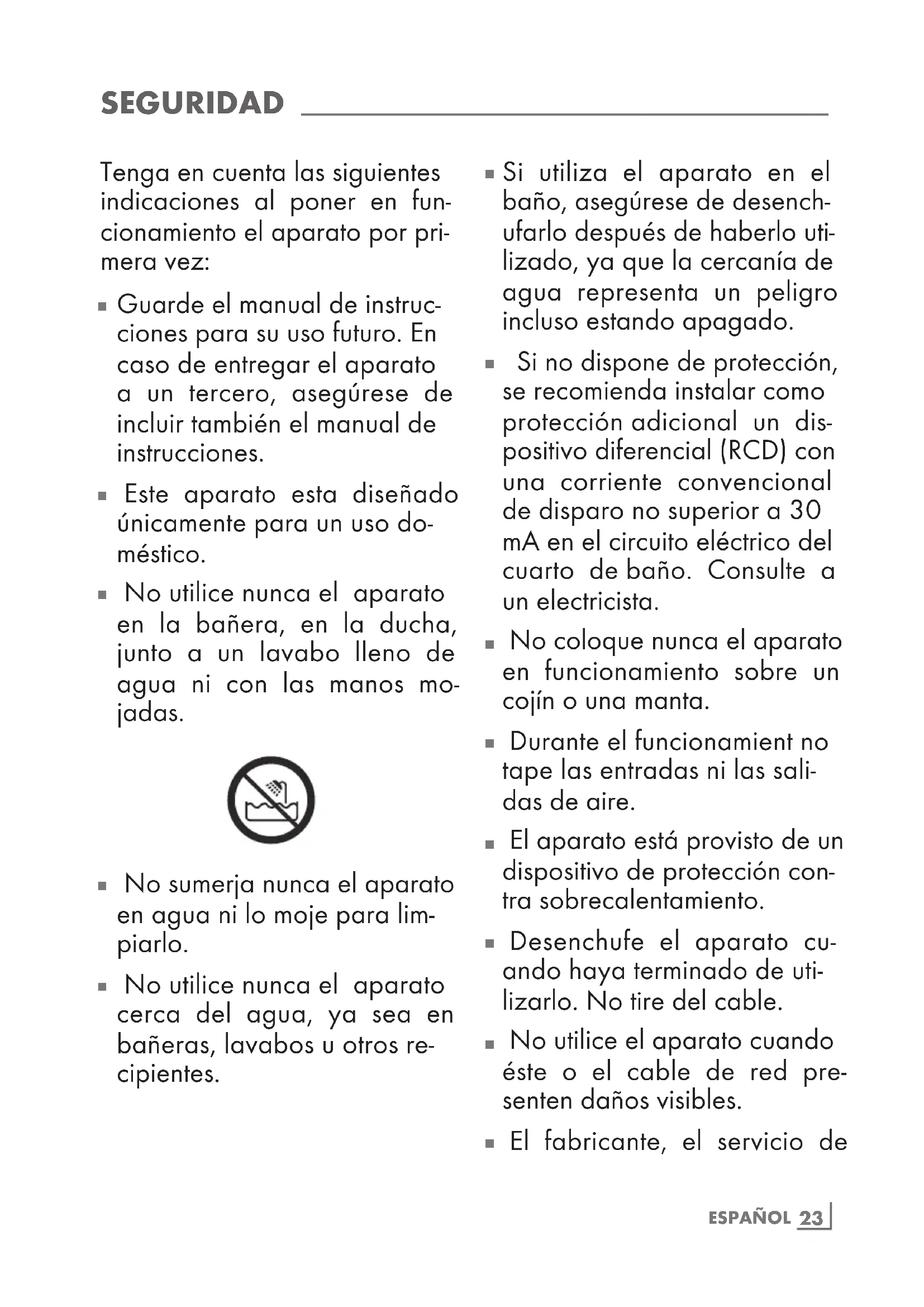 No utilice nunca el aparato en la bañera, en la ducha, junto a un lavabo lleno de agua ni con las manos mo- jadas.